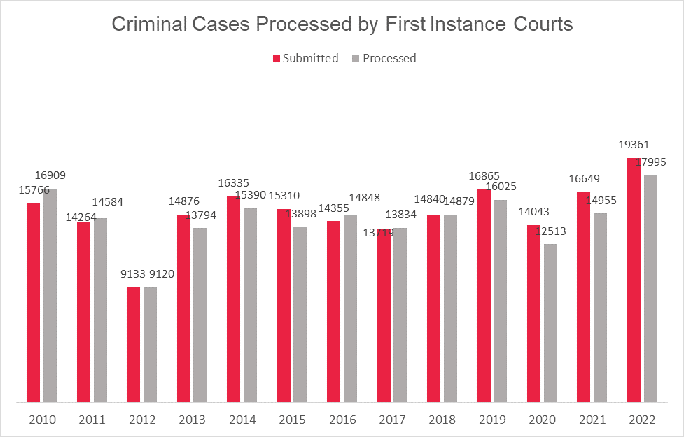 - In the years 2010-2022, the highest number of criminal cases (19,361) were filed in the courts of first instance in 2022.