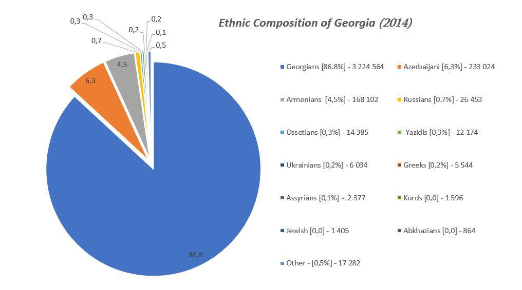 According to the last general census conducted in Georgia in 2014, ethnic minorities (excluding occupied Abkhazia and Tskhinvali regions) constitute 13.2% of the population (489,240 people). Two larger groups stand out in particular: the Azerbaijani community with 6.3% (233,024 people) and the Armenian community with 4.5% (168,102 people) [1].