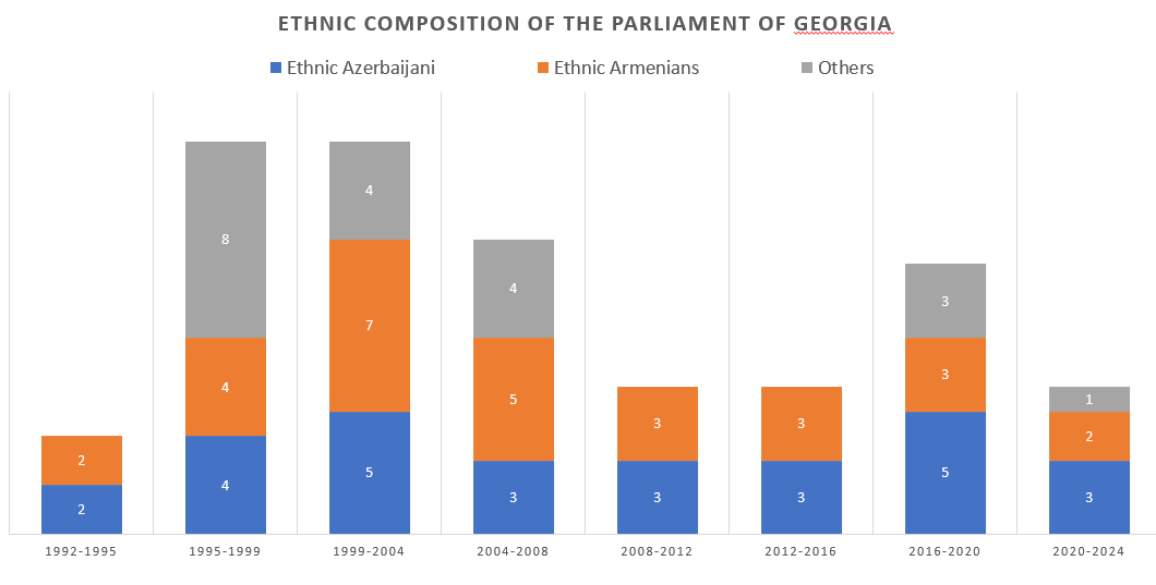 The representation of ethnic minorities in the Parliament of Georgia has remained a problem since the 90s. They had 4 representatives in the legislature in 1992-1995, 16 in 1995-1999 and 1999-2004, 12 in 2004-2008, 6 in 2008-2012 and 2012-2016, 11 in 2016-2020, and 7 in 2020-2024. The majority of MPs representing ethnic minorities belong to the Azerbaijani or Armenian communities.[6]