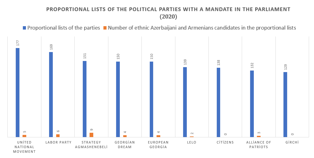 As a result of the 2020 parliamentary elections, 9 political parties won mandates in the legislative body. The analysis of their proportional lists shows that the representation of ethnic Azerbaijanis and Armenians is very weak. Only 33 of the 1,335 candidates on the proportional list of the 9 political parties with mandates in the 10th convocation parliament were ethnically Azerbaijani or Armenian [as identified by first and last names].