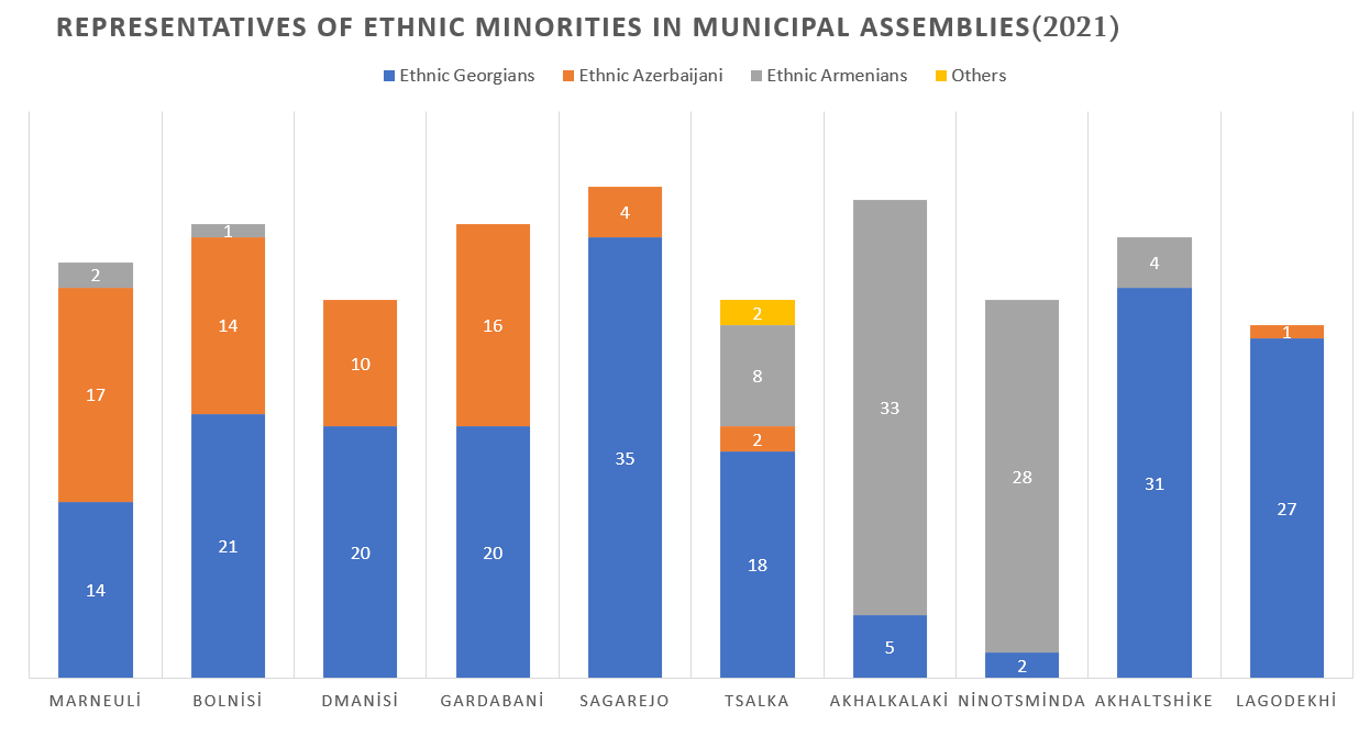 Similar to 2017, the results of the 2021 municipal body elections show that the representation of the Azerbaijani community at the local self-government level is particularly low. Except for the municipalities of Akhalkalaki, Ninotsminda, and Gardabani, their representation in the assemblies of other municipalities densely populated by ethnic minorities is two to three times lower compared to their proportional share in the population, and in some cases even lower.
