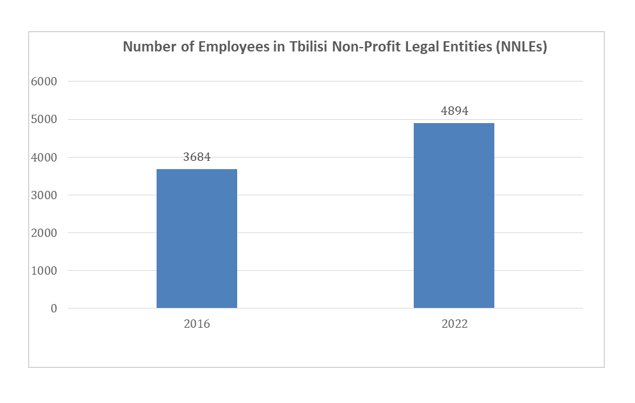 - In 2022, there were 4,894 employees (including part-time employees) in Tbilisi NNLEs, and the total remuneration amounted to 55.1 million GEL. Since 2016, the number of NNLEs in Tbilisi decreased from 79 to 71, but the number of employees increased from 3,684 to 4,894.