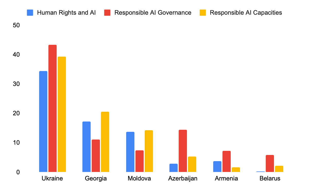 Georgia, while trailing behind Ukraine in all pillars and directions of the study, still performs notably within the Eastern European region. Except for the area of Responsible AI governance, where Azerbaijan surpasses Georgia by 3.46 points, Georgia ranks second among the countries evaluated in the region (note that Turkey and Russia were not included in the study).