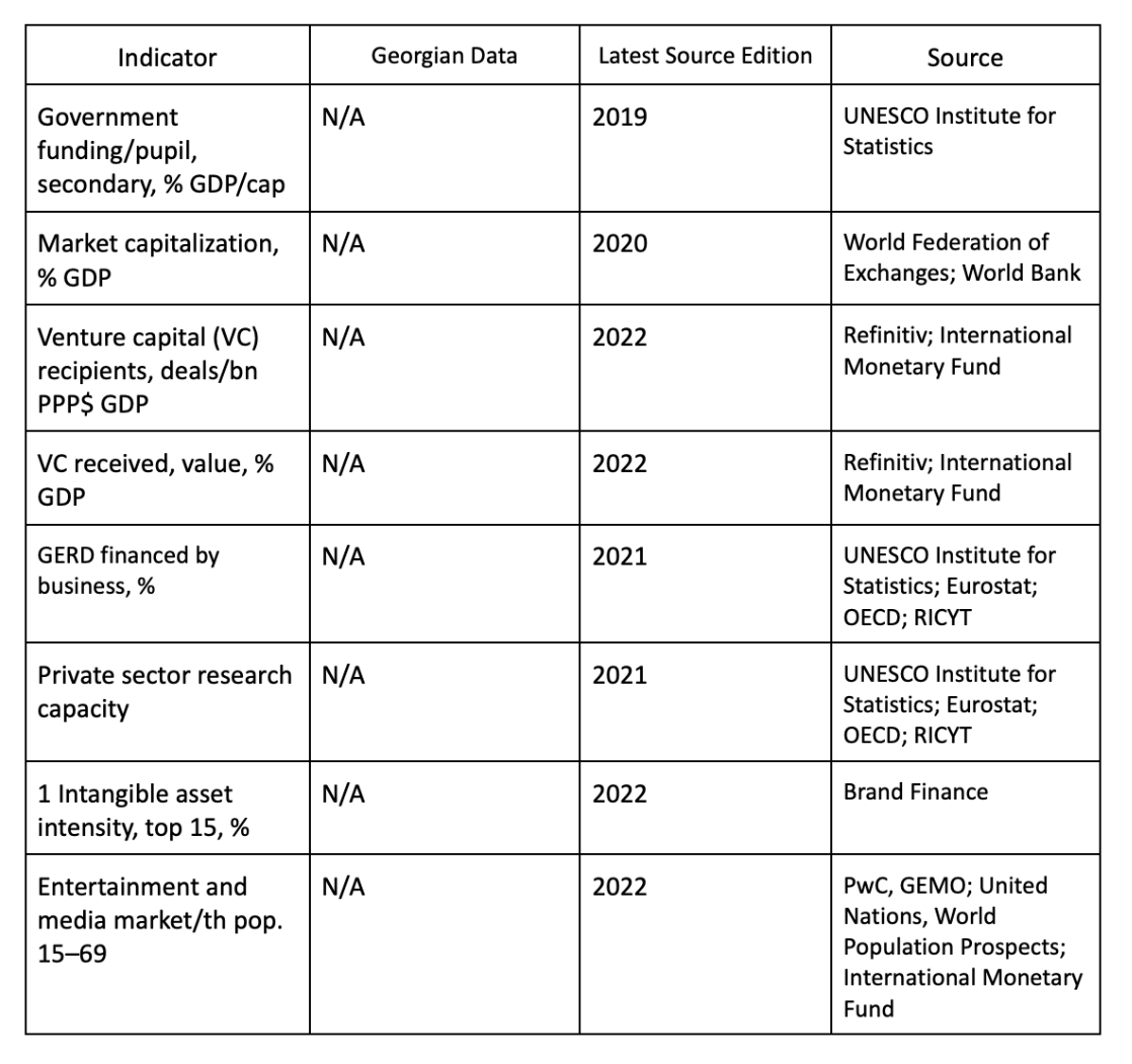 The GII Index uses a variety of sources, international indices, and reports for the assessment of specific indicators. The table presents the sources that did not include an assessment of Georgia, pointing to a need for the country to be more involved and produce data in these directions. Public agencies as well as non-governmental and academic institutions can collaborate with these sources. For example, The UNESCO Institute for Statistics cooperates with national statistical agencies, ministries, and other statistical agencies. Meanwhile, the Global Monitor of Entrepreneurship (GME) relies primarily on partnerships with leading academic institutions.