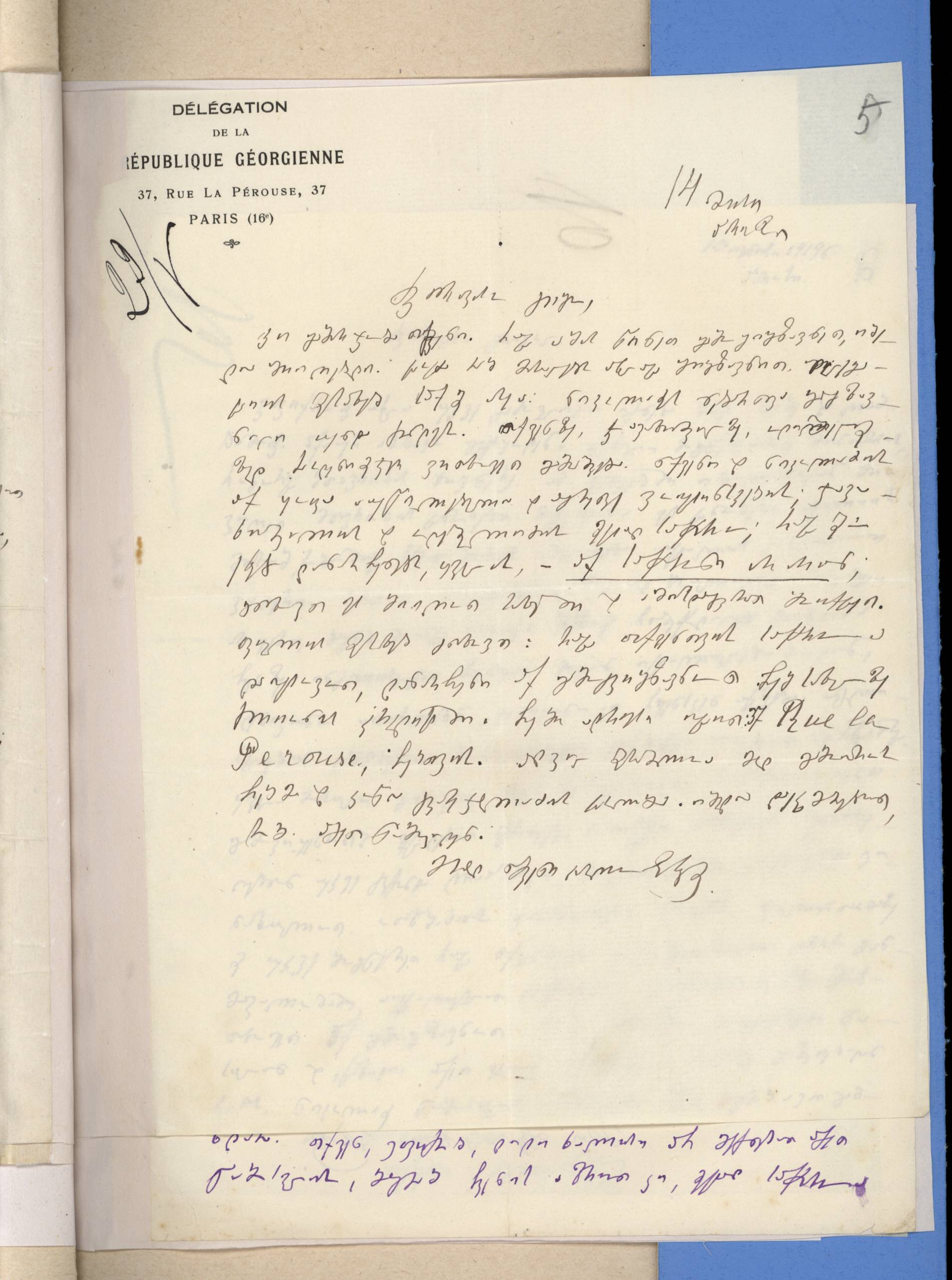 Karlo Chkheidze’s letter from Paris to Grigol Rtskhiladze on establishing a diplomatic mission (14 May 1919). Source: national Archives of Georgia, Central Historical Archive, fond 2115, opis 1, item 90.