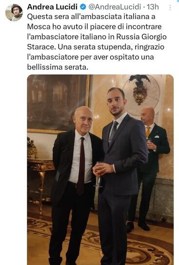 Following the event at the Italian embassy in Moscow, Lucidi posted a picture of himself with Italy’s ambassador to Moscow Giorgio Starace on X, with the caption: “I had a beautiful evening where I met Italy’s ambassador to Russia, Giorgio Starace.”