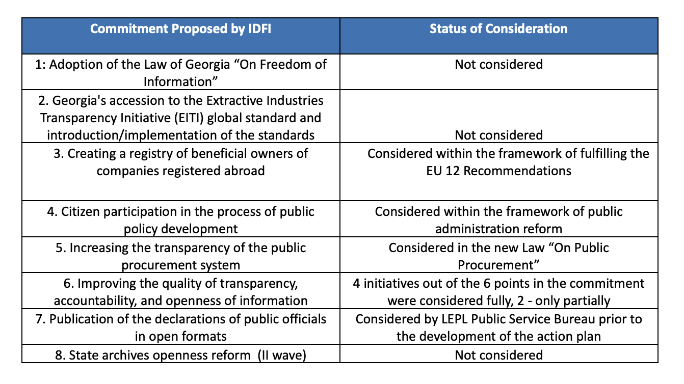 In accordance with the request from the Administration of the Government of Georgia, the Institute for Development of Freedom of Information (IDFI) presented 8 recommendations during the development process of the new Action Plan. Only a small part was considered in the final draft. The government was forced to consider one commitment, which it had refused to implement for one reason or another for years, within the framework of the 12 Recommendations from the European Commission. As a result, the creation of a registry of beneficial owners of companies registered abroad is included in the action plan “On the Approval of the Action Plan to Avoid Excessive Influence of Interests in Economic, Political, and Public Life in Georgia”. The fact that the government was forced to address an issue that had been neglected for years as a prerequisite for receiving the candidate status within the framework of recommendations from the European Commission clearly demonstrated the importance of the issues advocated by civil society representatives for the country. Out of the 8 recommendations presented by IDFI, 3 were not considered, including one star commitment. 1 was implemented prior to the approval of the action plan by LEPL Civil Service Bureau, 1 was included in the Public Administration Reform 2023-2026 Strategy, and 1 was considered in the new Law “On Public Procurement”, which will enter into force in 2025. In practice, only 1 recommendation was considered for the new action plan, consisting of 6 points, only 4 of which were considered fully.