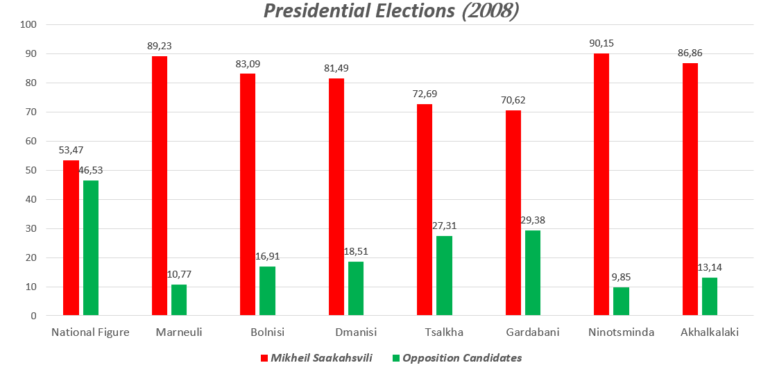 7 candidates (Mikheil Saakashvili, Levan Gachechiladze, Arkadi Patarkatsishvili, Shalva Natelashvili, Davit Gamkrelidze, Giorgi Maisashvili, Irina Sarishvili-Chanturia) fought for the post of president in the special elections. As a result of the elections, the candidate of the ruling party, Mikheil Saakashvili, accrued 53.47% of the votes (Election Administration of Georgia, 2008). Support for the candidate of the ruling party was most noticeable in constituencies densely populated by ethnic minorities.