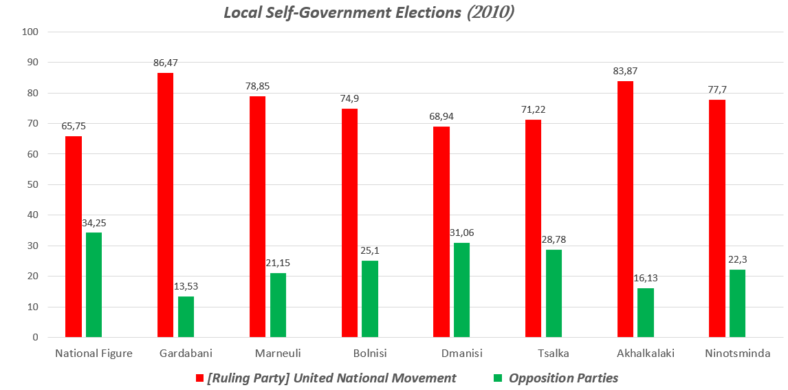 In the 2010 local self-government elections, 17 electoral subjects participated throughout Georgia. The then ruling party "United National Movement" traditionally enjoyed a significant advantage in the regions densely populated by ethnic minorities. All of the 43 representatives elected from administrative units inhabited by ethnic Azerbaijanis of Kvemo Kartli, Samtskhe-Javakheti, and Kakheti, and 52 out of 54 representatives elected from administrative units inhabited by ethnic Armenians belonged to the ruling team (Election Administration of Georgia, 2010). In the regions densely populated by ethnic minorities, the elections took place in a non-competitive environment, and in the vast majority of districts, the candidates of the ruling party won an average of 80-90% of the votes.