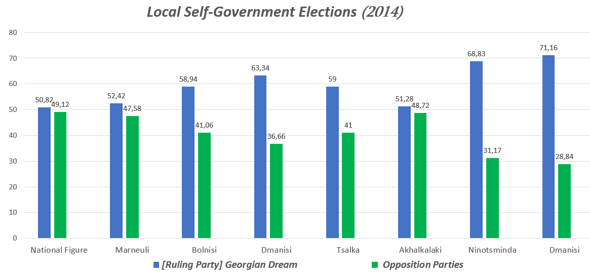 As a result of the elections, "Georgian Dream" received an average of 60.71% of votes in 7 electoral districts densely populated by non-dominant ethnic groups, which is 16.7% lower than the results achieved by the previous ruling party in 2010. As compared to 2010, the votes of opposition parties in the above-mentioned 7 constituencies increased from 22.6% to 39.29%. 5 parties in Akhalkalaki, 4 in Ninotsminda, and 3 parties each in Gardabani, Tsalka, Dmanisi, Marneuli, and Bolnisi won mandates in municipal assemblies according to the proportional voting rules.