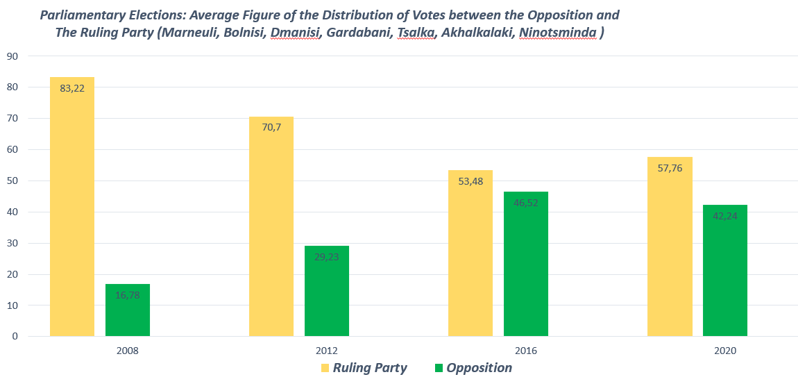 Some experts state that, since 1990, almost all elections have been held under the dominance of the ruling parties, with their victory rarely questioned, not only in the regions densely populated by ethnic minorities, but throughout the country. The situation has changed since 2008 (and relatively late in the regions densely populated by ethnic minorities, after 2012) and this has been noticeable in the results achieved by the opposition forces in the elections. Some of them also positively evaluated the strengthening of law and order in the regions densely populated by ethnic minorities and the reforms carried out in some directions after the "Rose Revolution", and this also influenced their electoral behavior to a certain extent. In 2008, the ruling party "United National Movement" won an average of 85% of the votes in 7 municipalities densely populated by non-dominant ethnic groups (Marneuli, Bolnisi, Dmanisi, Gardabani, Tsalka, Akhalkalaki, Ninotsminda). The figure decreased to 70.7% in 2012. In 2016, the ruling party "Georgian Dream" managed to mobilize only 53.48% of the votes in the above-mentioned 7 electoral districts, and 57.76% in 2020. Support for the ruling party is more pronounced in the municipalities of Akhalkalaki and Ninotsminda. Focus group participants mostly attribute this to the non-competitive political environment in the peripheral regions. Overall, compared to 2008, in 2020, the number of votes received by opposition parties in the above-mentioned 7 municipalities densely populated by ethnic minorities has almost tripled, from 15% to 42.24%.