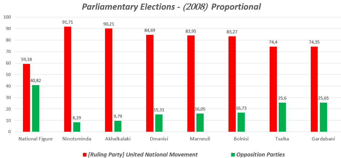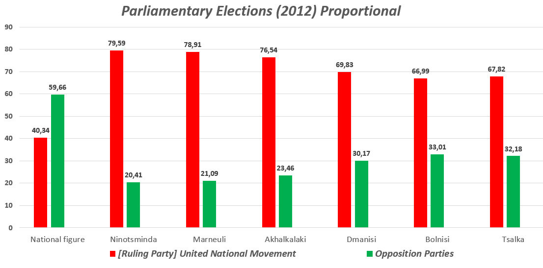 "United National Movement" came second proportionally in Marneuli, Ninotsminda, Dmanisi, and Gardabani constituencies, "Nino Burjanadze - United Opposition" came second in Tsalki and Bolnisi constituencies, and "Non-parliamentary opposition (Kakha Kukava, Pikria Chikhradze)" came second in Akhalkalaki.