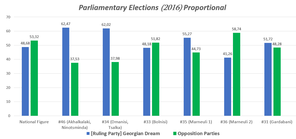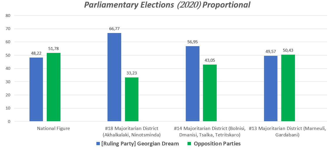 In the last parliamentary elections, Georgian Dream received 66.77% of the votes in the #18 electoral district (Akhalkalaki-Ninotsminda) and 56.95% in the #14 electoral district (Bolnisi, Dmanisi, Tsalka, Tetritskaro). As in 2016, the ruling party won fewer votes than the opposition (49.57%) in Marneuli and Gardabani (#13 majoritarian district). In total, "Georgian Dream" proportionally collected 57.76% of the votes in the above-mentioned 3 majoritarian constituencies.