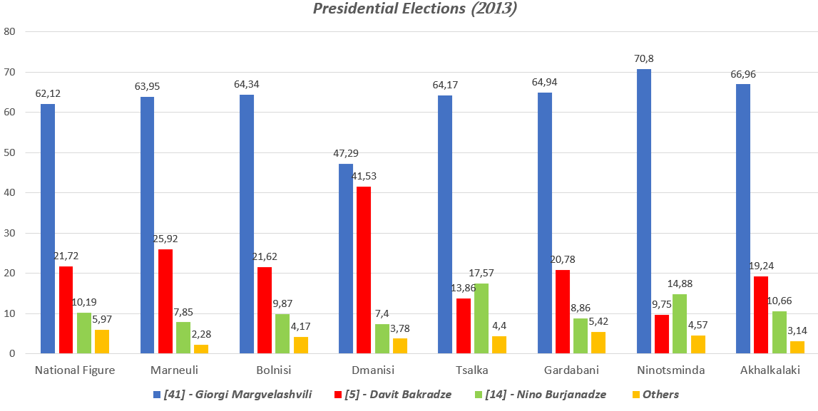 The elections of October 27, 2013, were the first presidential elections held after the change of government and the transition to the parliamentary governance model. According to the Election Administration of Georgia, 23 candidates participated in the presidential elections (Election Administration of Georgia, 2013). Among them, the main opponents were Giorgi Margvelashvili from the "Georgian Dream" coalition, Davit Bakradze from the "United National Movement", and Nino Burjanadze, the candidate of "Democratic Movement - United Georgia". As a result of the elections, Giorgi Margvelashvili won with 62.12% of the votes. It is interesting to note that, unlike the 2008 presidential elections, support for the candidate of the ruling party in regions densely populated by ethnic minorities did not differ as much (only 1.08% higher) from the national figure (Election Administration of Georgia, 2013).