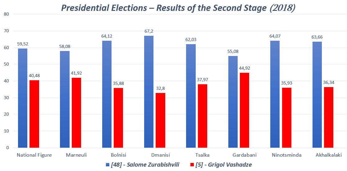 It should be noted that despite the support of the ruling party in the first round of the elections, Salome Zurabishvili won more votes than her opponents in only four of the seven electoral districts densely populated by ethnic minorities. With the support of the ruling party, Salome Zurabishvili won with 59.52% in the second round (Election Administration of Georgia, 2018).