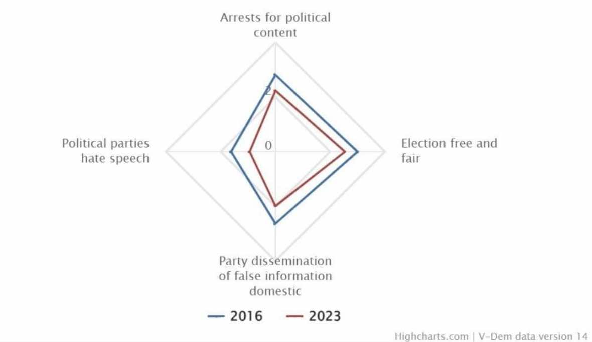 - Arrests for political content: the indicator answers the question — If a citizen shares an online post with political content that is critical of government policies, what is the likelihood that this citizen will be arrested? The report notes that civic activists expressing dissent increasingly face political arrests and charges. These tensions constitute risks to electoral integrity.
