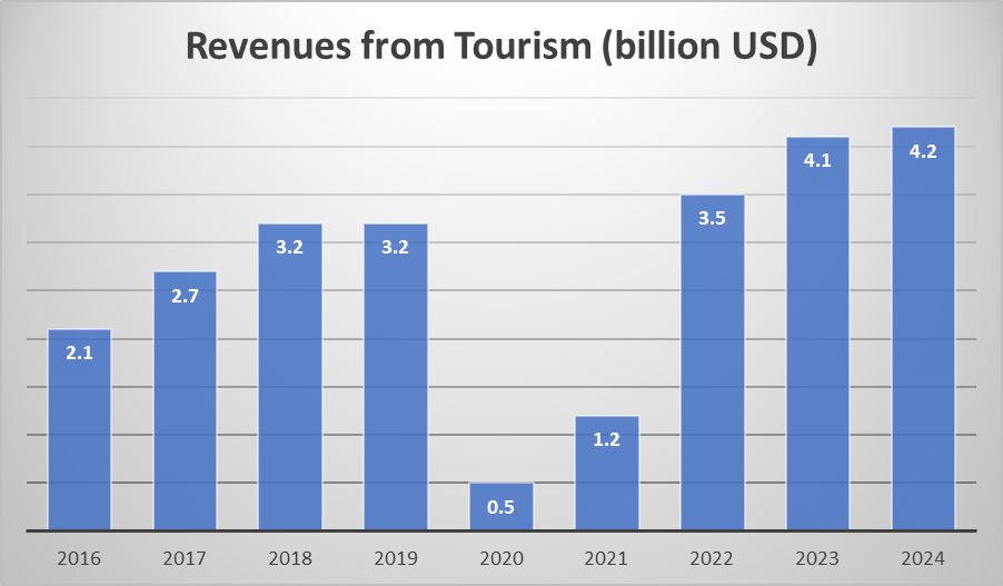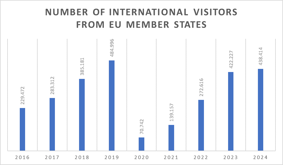The effect of the visa-free travel that went into force at the end of March 2017 was already evident in the second half of the year. The number of visits from EU countries increased by 20% in 2017 when compared to the figures from 2016, and the rate of growth was even higher in 2018. The number of tourists from the EU peaked in 2019 and has not returned to that level since the Covid pandemic.