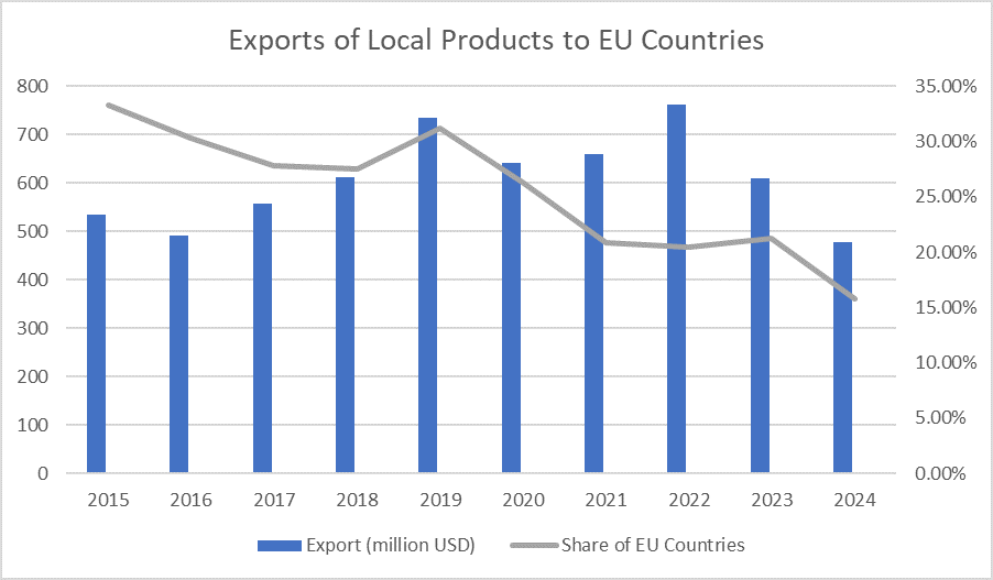 The establishment of visa-free travel was preceded by the entry into force of the Deep and Comprehensive Free Trade Area agreement between Georgia and the EU on July 1, 2016 (although it should be noted that some parts of the agreement were in force since September 1, 2014, which allowed Georgia and the EU to begin cooperation and prepare the market for the full entry into force of the agreement). Visa-free travel with the EU plays an important role for Georgian entrepreneurs, allowing them to establish contacts with potential business partners. Although numerous challenges have risen in terms of accessing the EU market and the export figures in recent years have been declining, DAFTA has nevertheless become the basis for the diversification of the economy, development of bio agriculture, improvement of food safety standards, refinement of customs regulations, strengthening support for small and medium-sized businesses, and development in many other areas. The exports of local products to EU countries showed significant growth since the agreement went into effect - in 2019, the share of the EU in the country’s exports exceeded 30% and Georgian entrepreneurs sold products worth over 700 million USD in the West. The exports of local products to the EU underwent the largest decline in 2024 and fell below the 2016 figures.