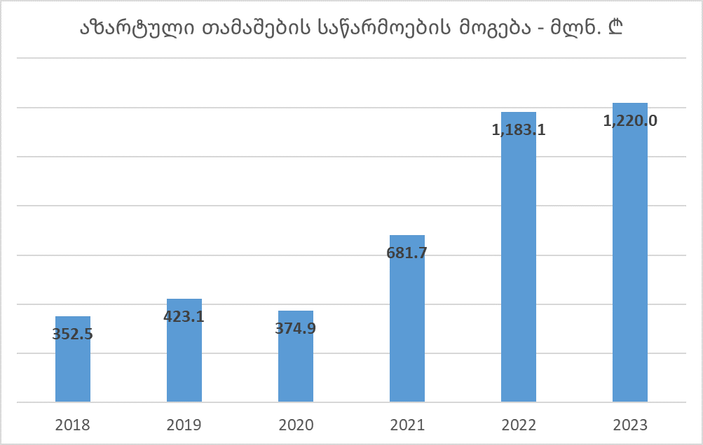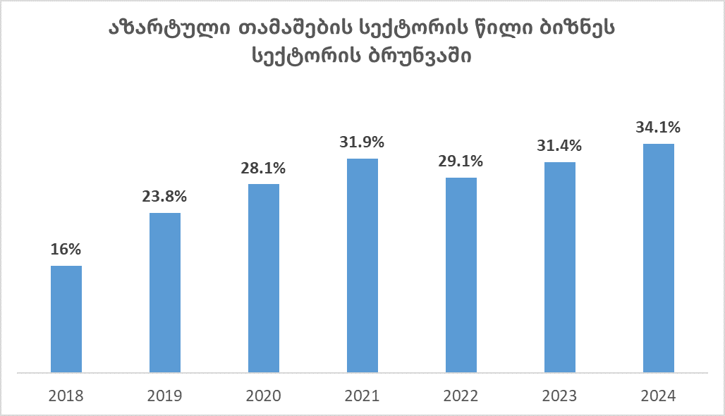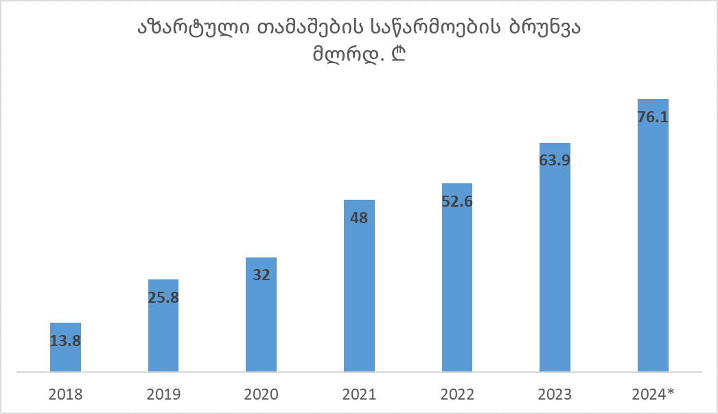 სტატისტიკის ეროვნული სამსახურის, წინასწარი მონაცემებით, 2024 წელს ბიზნეს სექტორის ბრუნვის მაჩვენებლებში ერთ-ერთი ყველაზე დიდი კონტრიბუცია სწორედ აზარტულ თამაშებს ჰქონდათ - სექტორის ბრუნვის მაჩვენებელი საბითუმო და საცალო ვაჭრობის სექტორსაც კი უტოლდება.