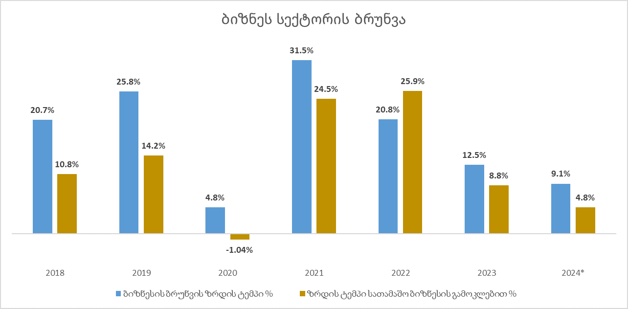 საქსტატის წინასწარი მონაცემებით, 2024 წელს, წინა წელთან შედარებით ჯამში ბიზნეს სექტორის ბრუნვის მოცულობა 9%-ით გაიზარდა, რაც კოვიდ პანდემიური 2020 წლის შემდგომ, ყველაზე დაბალი მაჩვენებელია. 2024 წელს, კლება ფიქსირდება "სოფლის, სატყეო და თევზის მეურნეობის" მიმართულებით, ასევე საბითუმო და "საცალო ვაჭრობის მიმართულებით" რომელიც ავტომობილების და მოტოციკლების რემონტსაც მოიცავს და "სხვა სახის მეურნეობების" მიმართულებით. სოფლის მეურნეობის დარგში წლიური კლება 8.1%-ს შეადგენს, საბითუმო ვაჭრობის დარგში 1.6%-ს, ხოლო სხვა სახის მეურნეობებში 7.6%-ს.