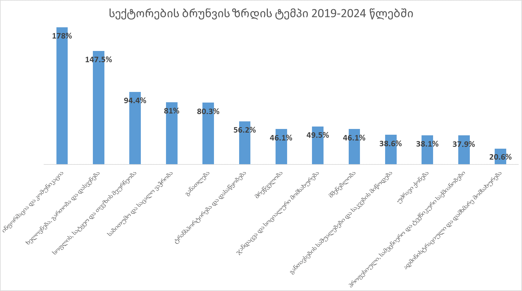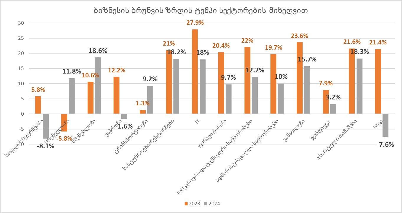 ამასთან, წინა წელთან შედარებით, 2024 წელს ზრდის ტემპი მცირედით (-2.8%-ული პუნქტი) შემცირდა რესტორნებისა და სასტუმროების სექტორში; ასევე 2023 წლის 28%-დან, 18%-მდე შემცირდა IT სექტორის ბრუნვის მოცულობის ზრდის ტემპი 2024 წელს - რაც ბოლო წლების განმავლობაში ყველაზე დაბალი მაჩვენებელია. შედარებისთვის - სექტორის ზრდის ტემპი 2021 წელს 31.7%-ს შეადგენდა, 2022 წელს კი რეკორდულ - 65%-ს. მნიშვნელოვანი კლება ფიქსირდება უძრავი ქონების მიმართულებით, სადაც 2023 წელს ზრდა 20.4%-ს შეადგენდა, 2024-ში კი 9.7%-ს. ანალოგიურად, თითქმის განახევრებულია ზრდის ტემპი "სამეცნიერო და ტექნიკური " და "ადმინისტრაციული საქმიანობების" მიმართულებით. განათლების სექტორში ზრდის ტემპი 15.7%-მდე შემცირდა - შედარებისთვის 2023 და 2022 წლებში ზრდის ტემპი 20%-ზე მაღალი იყო. 3.2%-მდეა შემცირებული ჯანდაცვის სექტორის ბრუნვის ზრდის ტემპის მოცულობა გასული წლის თითქმის 8%-იანი ზრდის შემდგომ. ამასთან, აღსანიშნავია "სხვა სახის საქმიანობები", სადაც 2024 წელს, კლება ბოლო წლების განმავლობაში პირველად დაფიქსირდა.
