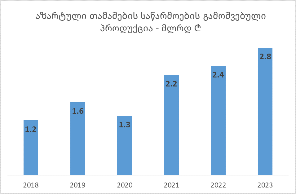 სტატისტიკის ეროვნული სამსახური მიუთითებს, რომ აზარტული თამაშების სექტორის საქმიანობის შესაფასებლად რეკომენდირებულია პროდუქციის გამოშვების მაჩვენებლის გამოყენება, რომელიც მიიღება ბრუნვის მოცულობიდან საპრიზო განაცემების (ანუ, მოგების სახით გაცემული თანხების) გამოკლებით. აღნიშნული სექტორის პროდუქციის გამოშვება წარმოადგენს თამაშებიდან მიღებული შემოსავლების ჯამს (Gross Gambling Revenue - GGR), რაც რჩება ბრუნვის მოცულობიდან საპრიზო განაცემების, ანუ მოგების სახით გაცემული თანხის გამოკლების შემდეგ. წლების განმავლობაში აღნიშნული მონაცემიც ზრდას აჩვენებს და 2023 წელს 2.8 მლრდ. ლარს უტოლდება.