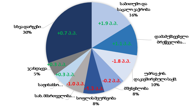 2021 წელის სამი კვარტლის მონაცემებით საბითუმო და საცალო ვაჭრობა და დამამუშავებელი მრეწველობა ყველაზე მაღალ წილს იკავებენ მშპ-ს დარგობრივ სტრუქტურაში, 16%-ს და 11%-ს, შესაბამისად. უძრავ ქონებასთან დაკავშირებული საქმიანობების წილი შემცირდა 1.8 პ.პ.-ით წინა წელთან შედარებით და 10%-ს შეადგენდა, ანალოგიურ პერიოდში. მნიშვნელოვნად შემცირდა (-1.3 პ.პ.) სოფლის მეურნეობის წილი წინა წელთან შედარებით. თუმცა, აღნიშნული ძირითადად სხვა სექტორების ზრდის ხარჯზე განხორციელდა.