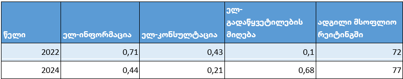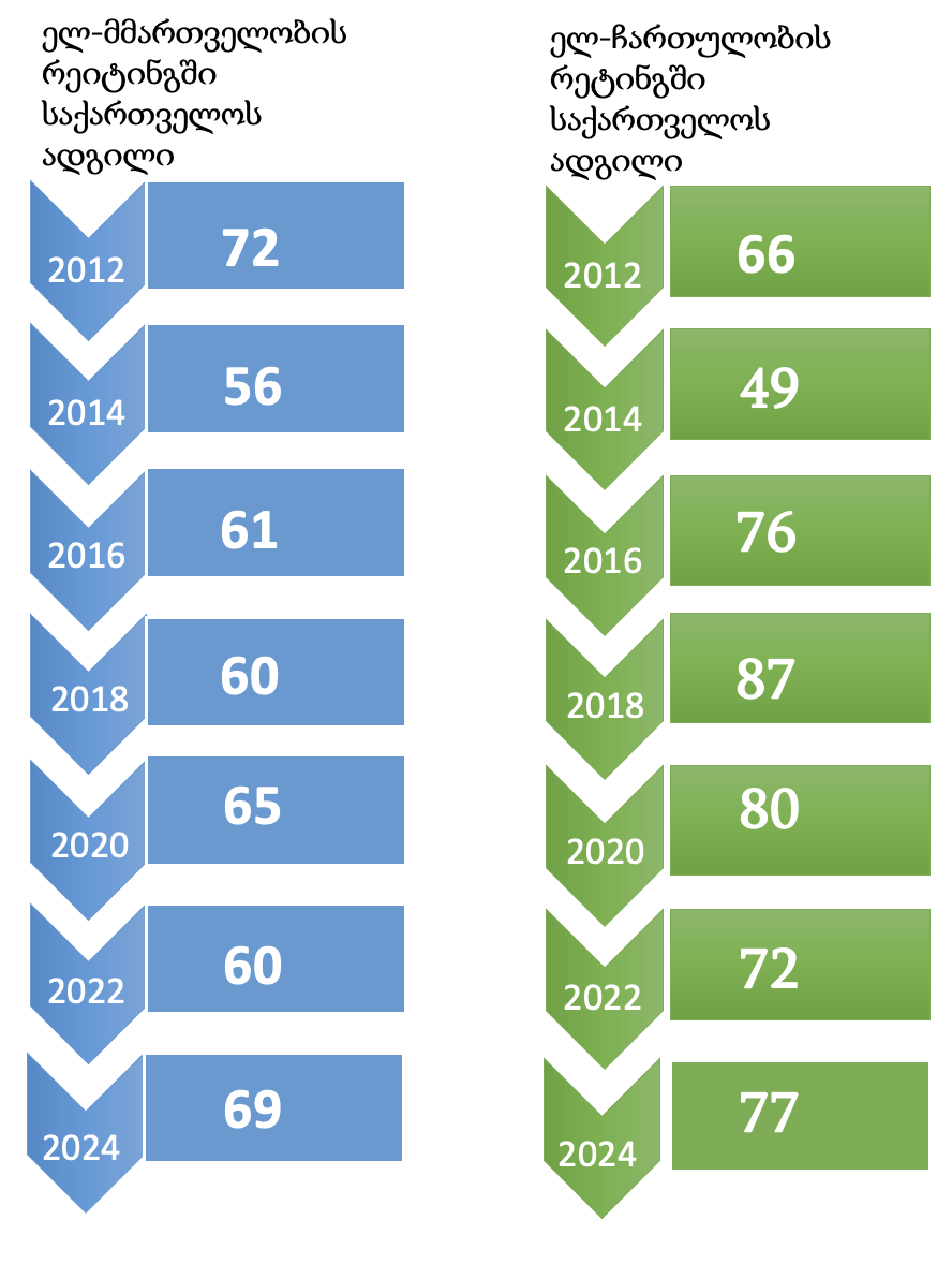 2024 წლის შეფასების მიხედვით, საქართველოს ელ-მმართველობის მაჩვენებელია 0.78, რითიც საქართველოს 193 ქვეყანას შორის 69-ე ადგილი უკავია. ორი წლის წინ, 0.75 ქულით, საქართველო მე-60 პოზიციას იკავებდა. შესაბამისად, 2024 წლისთვის საქართველომ საკუთარი ქულა 0.03 ერთეულით გაიუმჯობესა, თუმცა რეიტინგის პოზიციით 9 ადგილით დაქვეითდა. აღნიშნული სხვა ქვეყნების მიერ ამ მიმართულებით საქართველოსთან შედარებით უფრო სწრაფი განვითარების ტემპით შეიძლება აიხსნას.