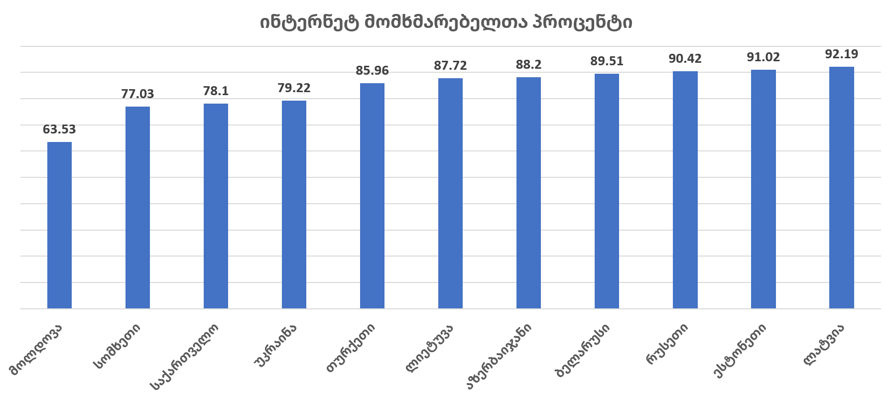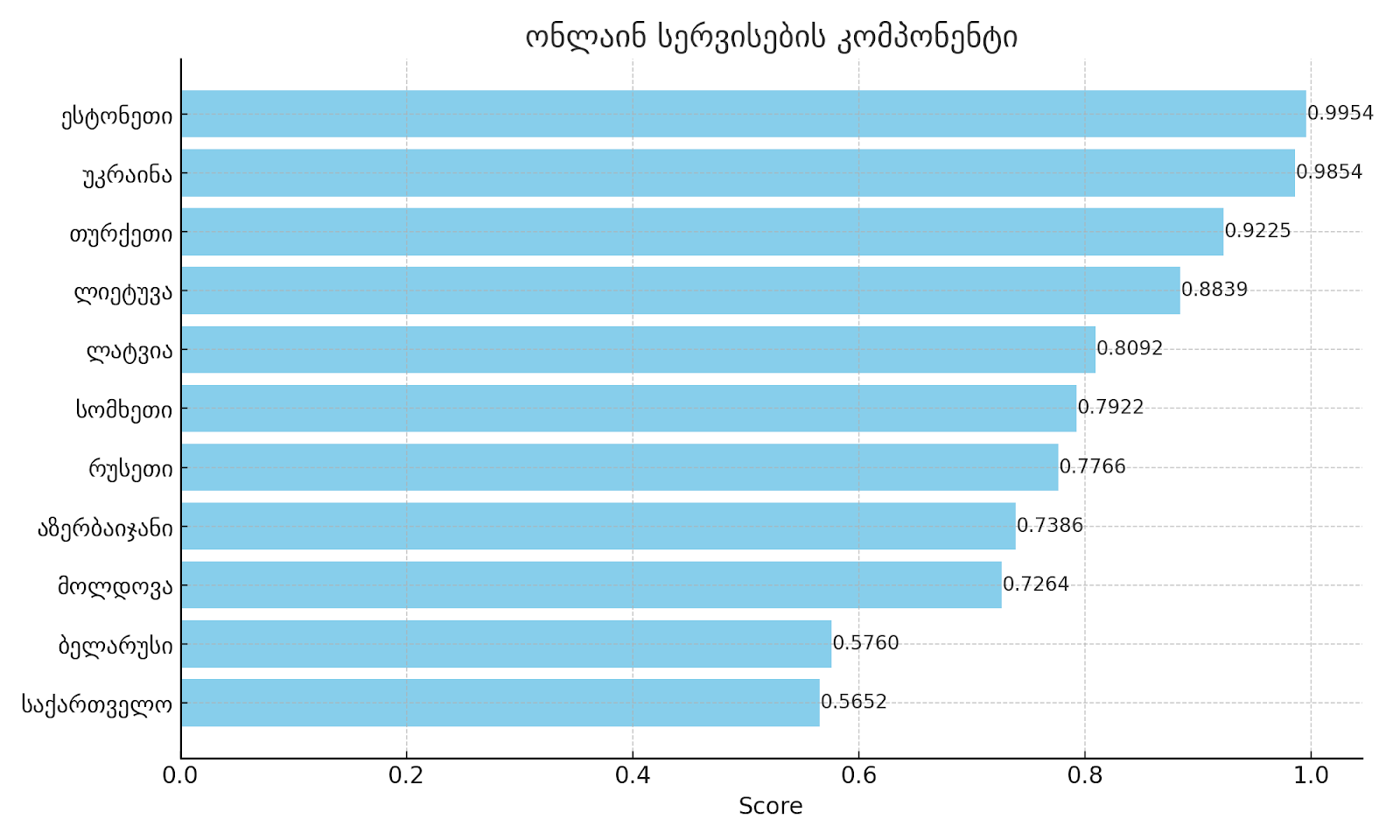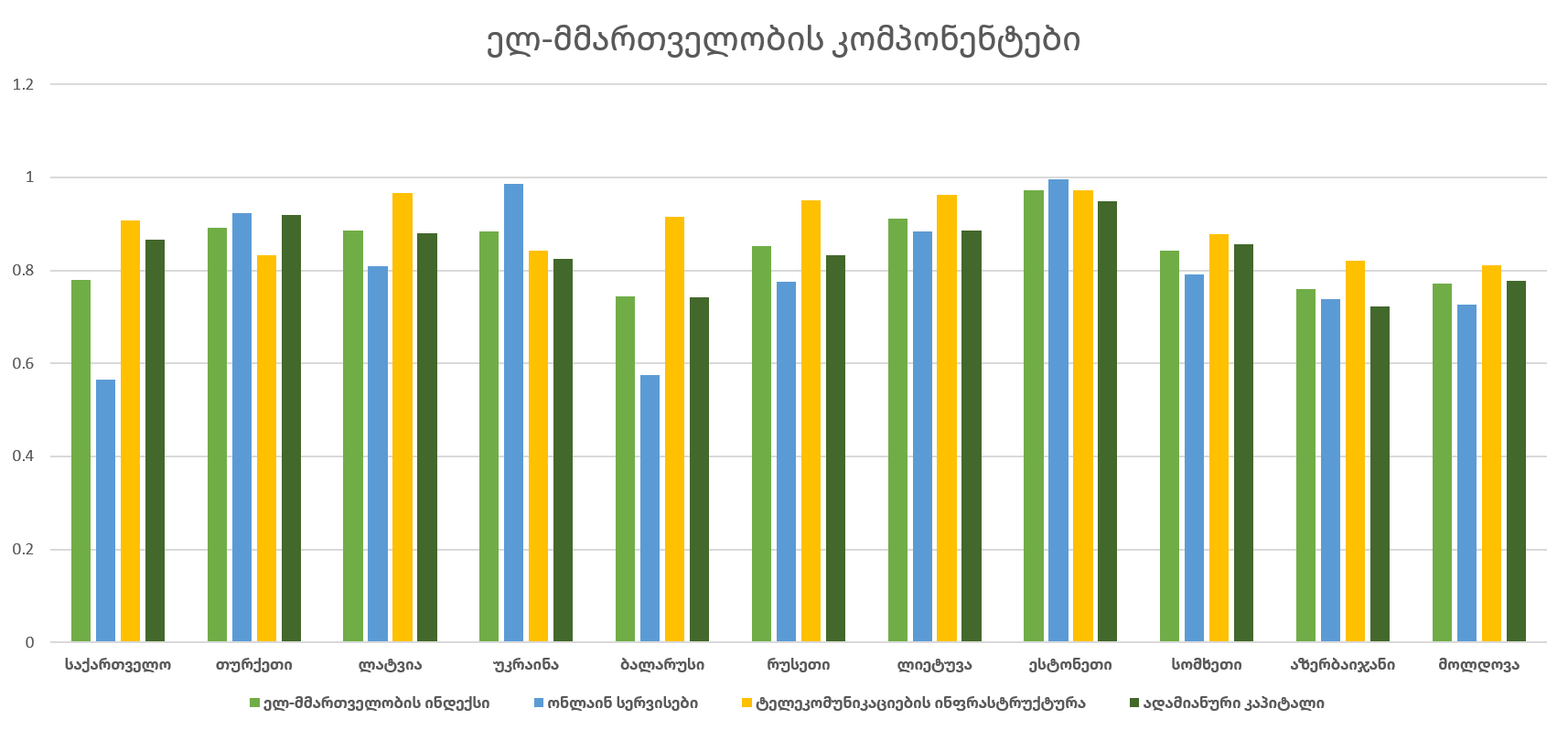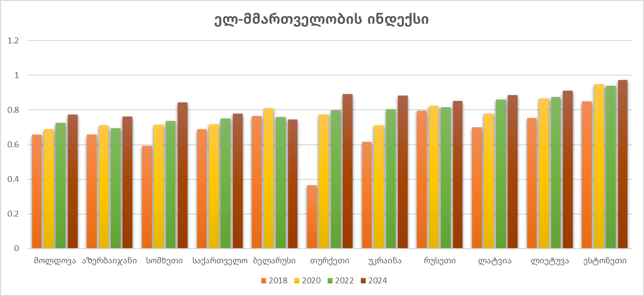 - ელ-მმართველობის ინდექსით საქართველო მეზობელი, აღმოსავლეთ პარტნიორობისა და ბალტიის 11 ქვეყანას შორის მე-8 ადგილზეა, მაგრამ ონლაინ სერვისების კომპონენტში საქართველოს მაჩვენებელი ყველა სხვა ქვეყნისას ჩამორჩება;