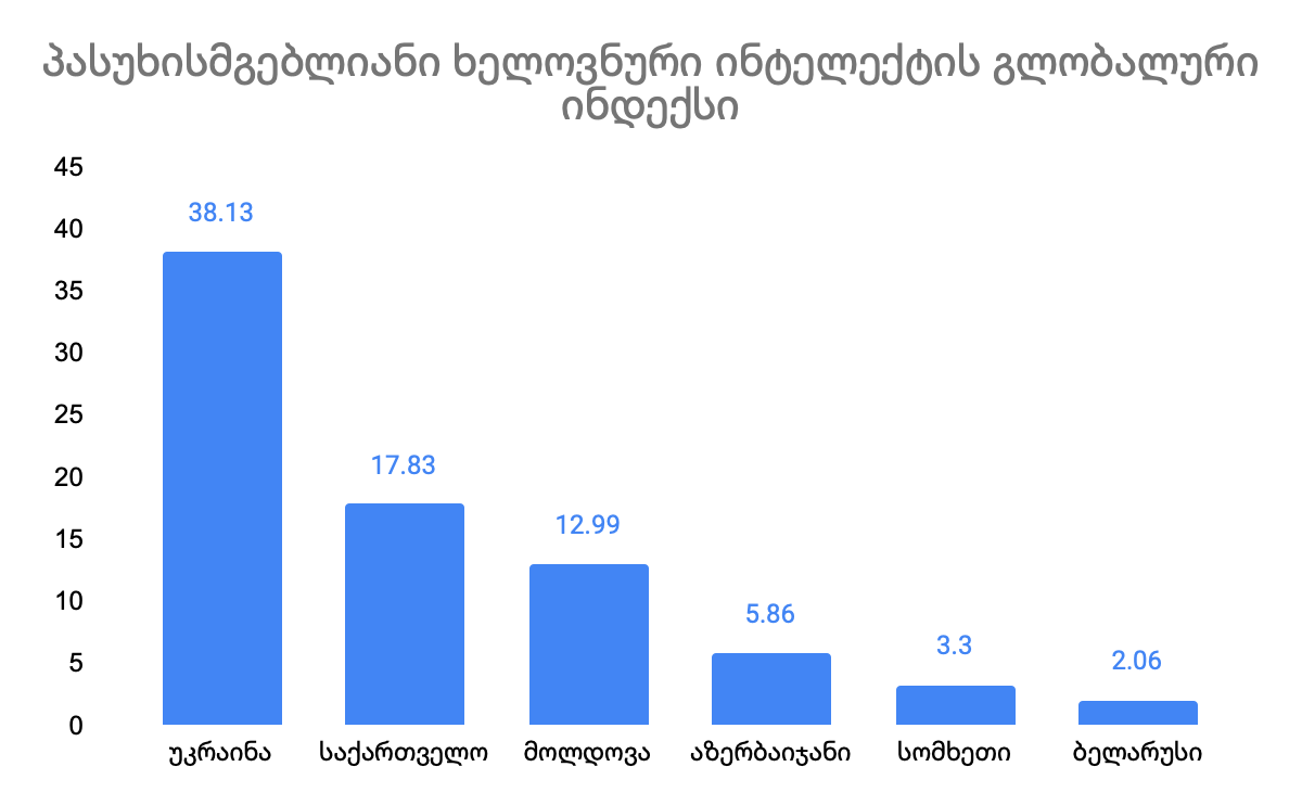 საქართველომ შედარებით მაღალი შეფასება პასუხისმგებლიან AI შესაძლებლობებშიც მიიღო. ქვეყანა ხელოვნური ინტელექტის ეთიკაზე UNESCO-ს რეკომენდაციებს არის მიერთებული, რაც ამ მიმართულების ერთ-ერთ საკითხს, საერთაშორისო თანამშრომლობას, ფარავს.