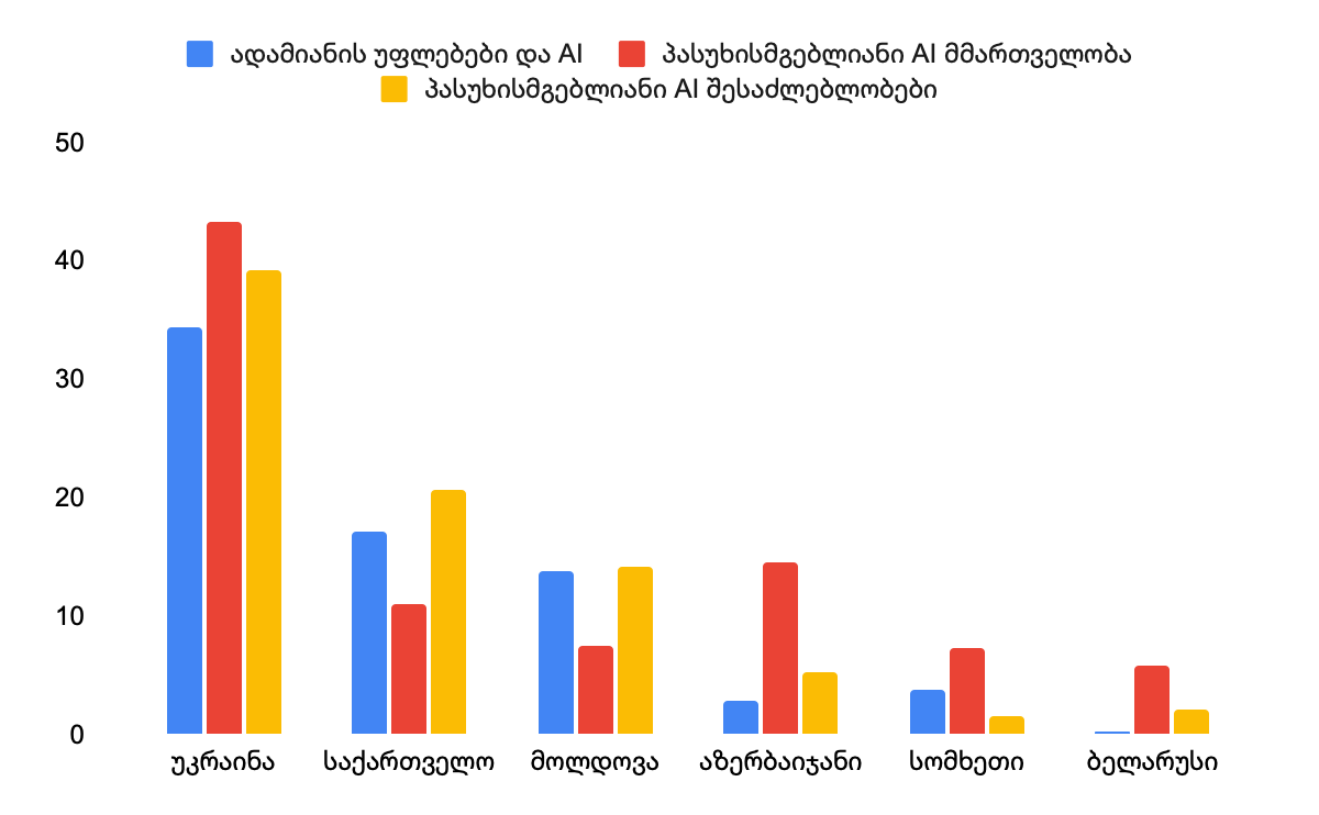 საქართველო უკრაინას ყველა ბლოკსა და ყველა მიმართულებით ჩამორჩება, თუმცა პასუხისმგებლიანი AI მმართველობის მიმართულების გარდა, სადაც საქართველოს 3.46 ქულით აზერბაიჯანი უსწრებს, რეგიონის ქვეყნებს შორის მეორე ადგილზეა. (კვლევაში არ არის შეფასებული თურქეთი და რუსეთი)