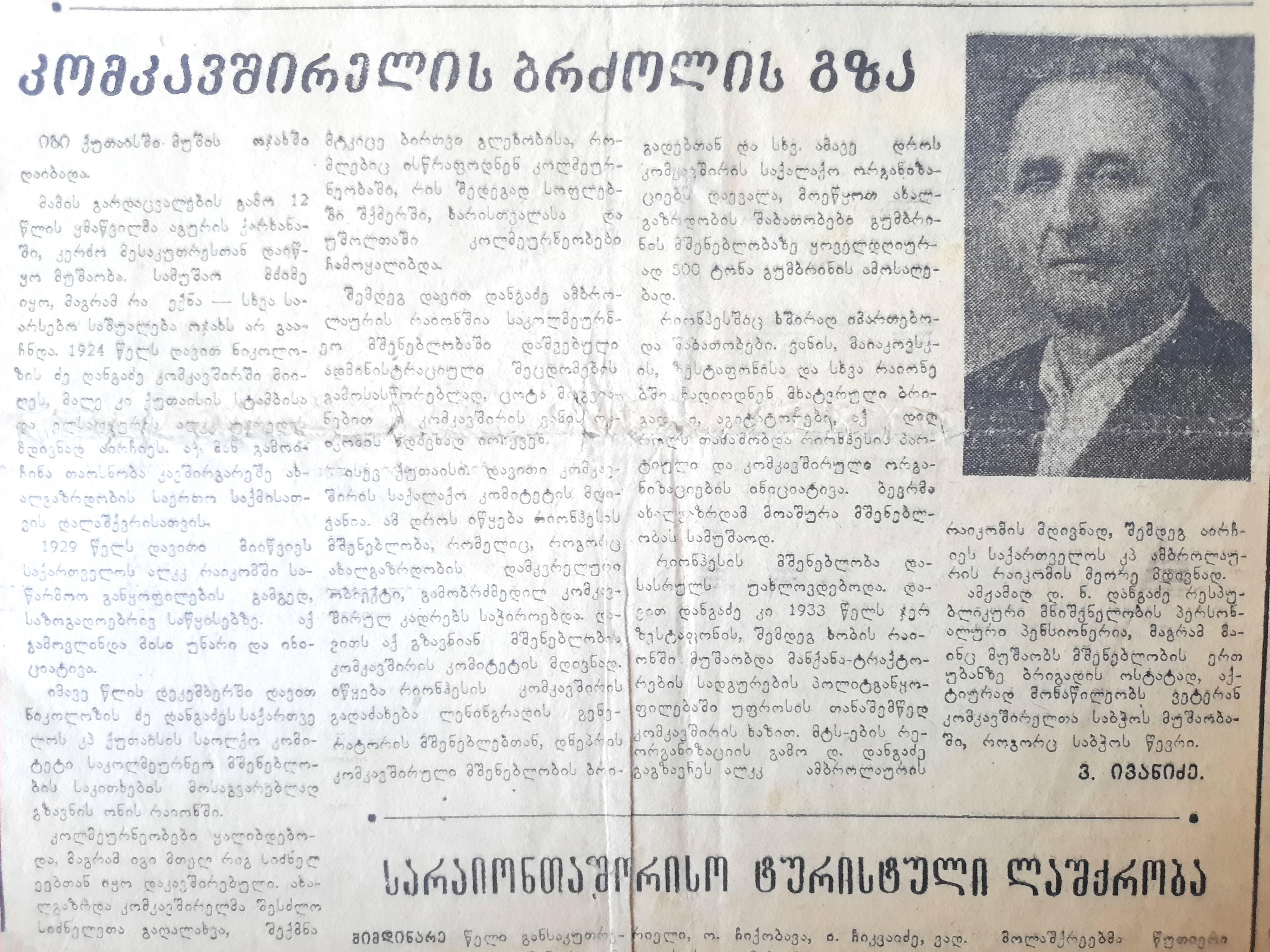 პარტიის ვეტერანთა საქალაქო, საბჭო „დ.ნ. დანგაძე,“ გაზეთი „ქუთაისი“, ქუთაისი, 25.08.1985;