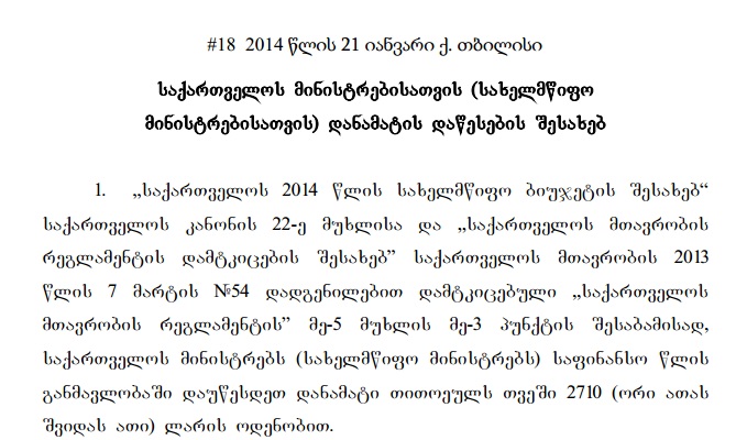 საქართველოს პრემიერ–მინისტრის 2014 წლის 21 იანვრის N18 ბრძანებით, მინისტრებს ყოველთვიური სახელფასო დანამატი 4 435 ლარიდან შეუმცირდათ 2710 ლარამდე. შესაბამისად, 2014 წლის იანვრის თვის შემდგომ მინისტრის ყოველთვიური შრომის ანაზღაურება თანამდებობრივი სარგოს (3540ლარი) და სახელფასო დანამატის (2710 ლარი) სახით ჯამში 6 250 ლარის ოდენობით (ხელზე 5 000 ლარი) განისაზღვრა.