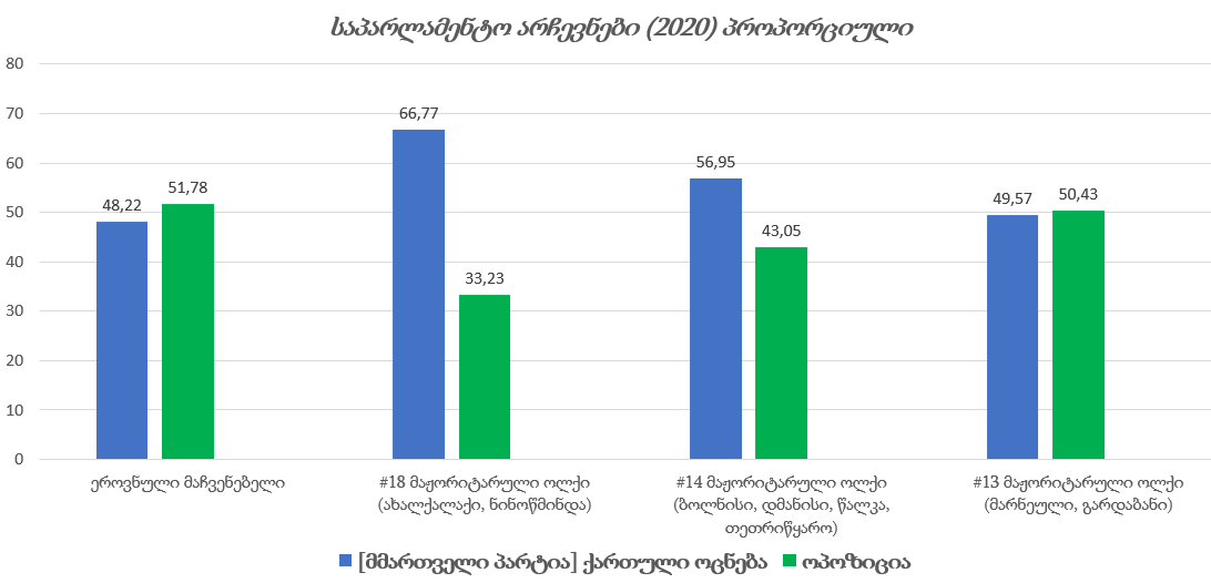 2020 წლის საპარლამენტო არჩევნების დროს, ეთნიკური უმცირესობებით მჭიდროდ დასახლებული პუნქტები შემდეგი მაჟორიტარული ოლქების შემადგენლობაში შედიოდა: #13 (მარნეული/გარდაბანი), #14 (ბოლნისი/დმანისი/წალკა/თეთრიწყარო/), #18 (ახალქალაქი/ნინოწმინდა). ზემოხსენებულ #13, #14 და #18 მაჟორიტარულ ოლქებში რეგისტრირებული 36 კანდიდატიდან 17 იყო ეთნიკური უმცირესობის წარმომადგენელი (#13 და #18 ოლქებიდან). #14 მაჟორიტარულ ოლქში (ბოლნისი/დმანისი/წაკლა/თეთრიწყარო) 13 საარჩევნო სუბიექტიდან არცერთი არ იყო ეთნიკური უმცირესობის წარმომადგენელი. არჩევნების შედეგად, სამივე მაჟორიტარულ ოლქში „ქართული ოცნების“ კანდიდატებმა ხმების ნახევარზე მეტი მოაგროვეს.