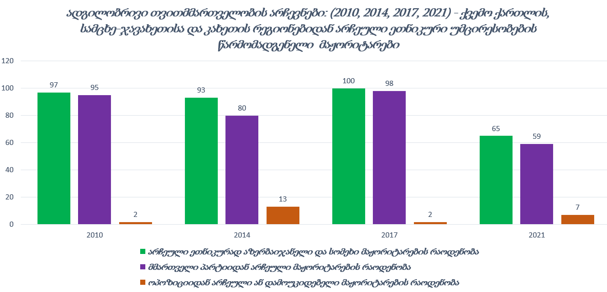 2021 წლის მუნიციპალიტეტის ორგანოთა არჩევნებში მონაწილეობა მიიღო 111-მა საარჩევნო სუბიექტმა, მათ შორის იყო 43 პარტია და ამომრჩეველთა 68 საინიციატივო ჯგუფი. ქვემო ქართლის მუნიციპალიტეტებში მერობის 17 კანდიდატიდან 3 იყო ეთნიკურად აზერბაიჯანელი, ხოლო სამცხე-ჯავახეთში 18-დან 6 იყო სომხური წარმოშობის. პოლიტიკურმა პარტიებმა ეთნიკური უმცირესობების წარმომადგენლებს, ტრადიციულად, მხოლოდ ახალქალაქში, ნინოწმინდისა და მარნეულის საარჩევნო ოლქში მისცეს უპირატესობა. მათ შორის თითო მუნიციპალიტეტში 3-3 კანდიდატი იყო რეგისტრირებული. 2017 წლის ადგილობრივი თვითმმართველობის არჩევნების მსგავსად, 2021 წელსაც „ქართული ოცნების“ მერობის კანდიდატებმა გაიმარჯვეს სამივე ოლქში. არჩევნების შედეგად, ქვემო-ქართლის, სამცხე-ჯავახეთისა და კახეთის რეგიონებიდან საკრებულოებში მაჟორიტარული წესით 65 აზერბაიჯანული ან სომხური თემის წარმომადგენელი იქნა არჩეული, მათ შორის 6 მაჟორიტარი ოპოზიციიდან და 1 დამოუკიდებელი კანდიდატი.