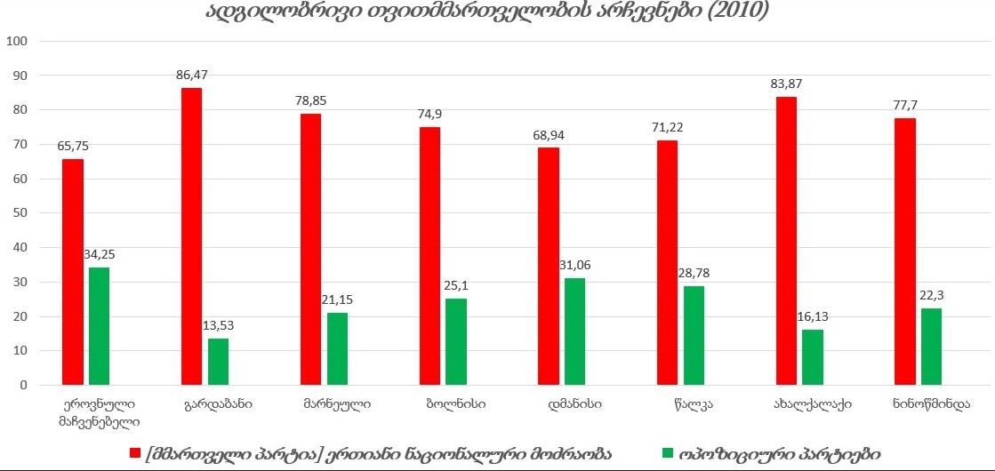 2010 წლის ადგილობრივი თვითმმართველობის არჩევნებში, საქართველოს მასშტაბით, 17 საარჩევნო სუბიექტი იღებდა მონაწილეობას. მაშინდელი მმართველი პარტია - „ერთიანი ნაციონალური მოძრაობა“, ტრადიციულად, ეთნიკური უმცირესობებით მჭიდროდ დასახლებულ რეგიონებში დიდი უპირატესობით სარგებლობდა. ქვემო ქართლის, სამცხე-ჯავახეთისა და კახეთის ეთნიკურად აზერბაიჯანელებით დასახლებული ადმინისტრაციული ერთეულებიდან არჩეული 43 მაჟორიტარიდან ყველა, ხოლო სომხებით დასახლებული ადმინისტრაციული ერთეულებიდან არჩეული 54 მაჟორიტარიდან 52 იყო მმართველი გუნდიდან (საქართველოს საარჩევნო ადმინისტრაცია, 2010). ეთნიკური უმცირესობებით მჭიდროდ დასახლებულ რეგიონებში არჩევნები არაკონკურენტულ გარემოში მიმდინარეობდა და ოლქების დიდ უმრავლესობაში მაჟორიტარული წესით მმართველი პარტიის კანდიდატები ხმების საშუალოდ 80-90%-ს აგროვებდნენ.