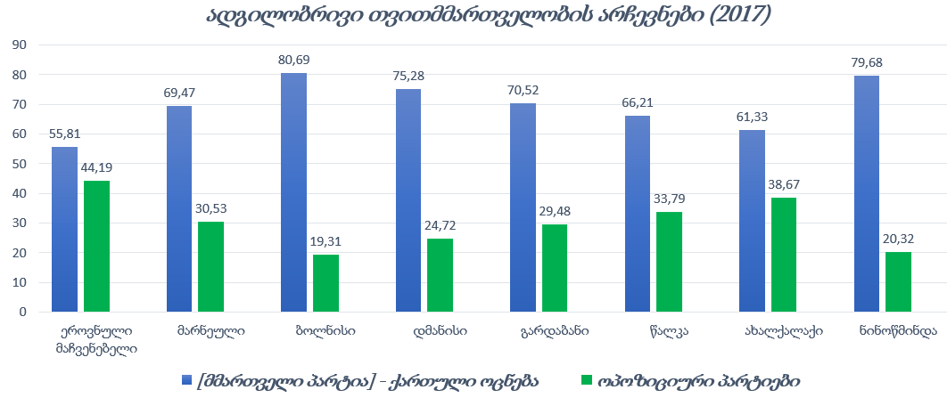 2017 წლის ადგილობრივი თვითმმართველობის არჩევნებში 22 პოლიტიკური პარტია და 5 საარჩევნო ბლოკი იღებდა მონაწილეობას. ქვემო ქართლის მასშტაბით, საკრებულოს მაჟორიტარობის კანდიდატების 38.4%, სამცხე-ჯავახეთში 35.7%, ხოლო კახეთში 4.8% იყო ეთნიკური უმცირესობის წარმომადგენელი. რაც შეეხება მერობის კანდიდატებს, ქვემო ქართლის რეგიონში 27 კანდიდატიდან 7, ხოლო სამცხე-ჯავახეთის რეგიონში 31-დან 10 იყო არადომინანტი ეთნიკური ჯგუფიდან. ისინი მარნეულში, გარდაბანში, ახალქალაქსა და ნინოწმინდაში იყრიდნენ კენჭს.