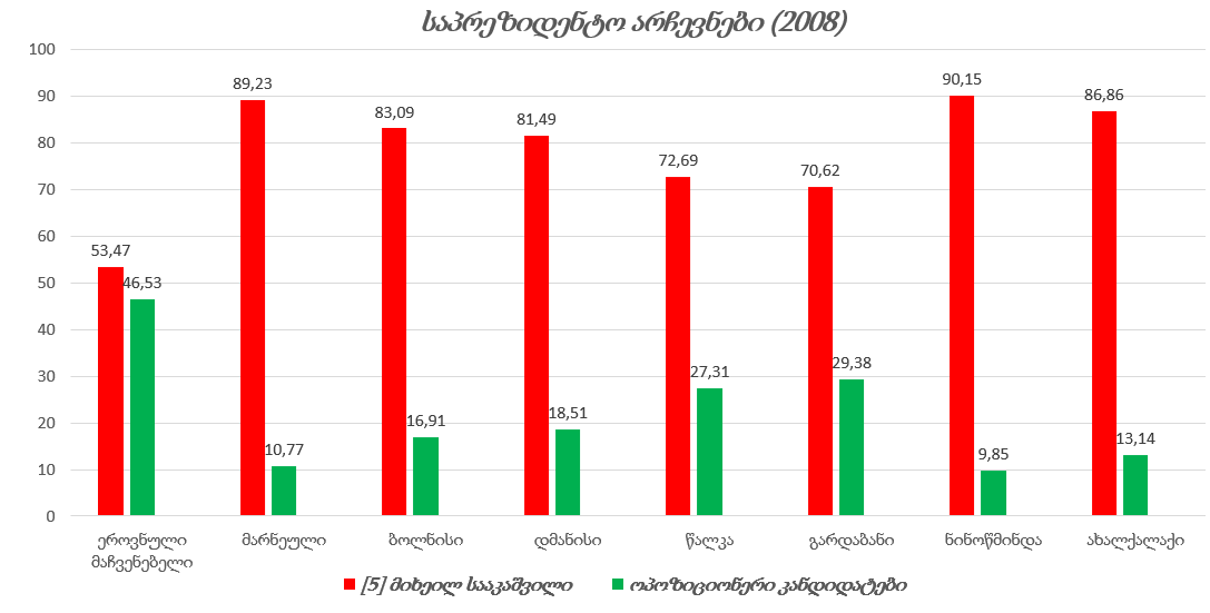 რიგგარეშე არჩევნებში პრეზიდენტის პოსტის დასაკავებლად 7 კანდიდატი (მიხეილ სააკაშვილი, ლევან გაჩეჩილაძე, არკადი პატარკაციშვილი, შალვა ნათელაშვილი, დავით გამყრელიძე, გიორგი მაისაშვილი, ირინა სარიშვილი-ჭანტურია) იბრძოდა. არჩევნების შედეგად მმართველი პარტიის კანდიდატმა, მიხეილ სააკაშვილმა ხმების 53,47% მოაგროვა (საქართველოს საარჩევნო ადმინისტრაცია, 2008). მმართველი პარტიის კანდიდატისადმი მხარდაჭერა ყველაზე მეტად იმ საარჩევნო ოლქებში შეიმჩნეოდა, სადაც ეთნიკური უმცირესობები კომპაქტურად იყვნენ დასახლებულნი.