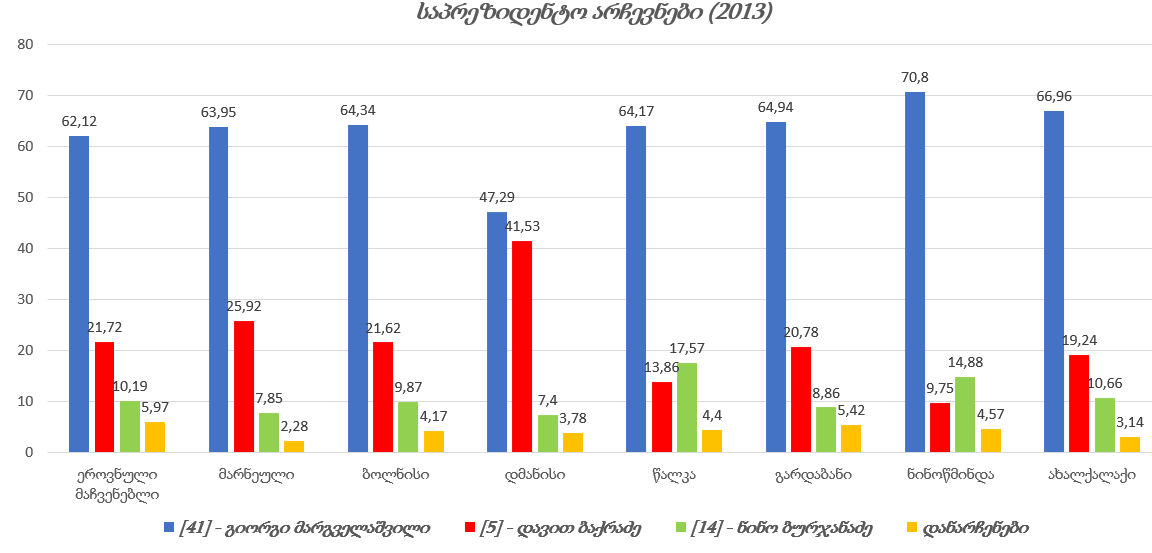 2013 წლის 27 ოქტომბრის არჩევნები სახელისუფლებო ცვლილებებისა და საპარლამენტო მმართველობის მოდელზე გადასვლის შემდეგ ჩატარებული პირველი საპრეზიდენტო არჩევნები იყო. საქართველოს საარჩევნო ადმინისტრაციის ინფორმაციით, საპრეზიდენტო არჩევნებში 23 კანდიდატი მონაწილეობდა (საქართველოს საარჩევნო ადმინისტრაცია, 2013). მათ შორის მთავარი ოპონენტები იყვნენ „ქართული ოცნების“ კოალიციიდან - გიორგი მარგველაშვილი, „ერთიანი ნაციონალური მოძრაობიდან“ დავით ბაქრაძე და „დემოკრატიული მოძრაობა - ერთიანი საქართველოს“ კანდიდატი ნინო ბურჯანაძე. არჩევნების შედეგად, გიორგი მარგველაშვილმა 62,12%-ით გაიმარჯვა. საინტერესო ფაქტია, რომ 2008 წლის საპრეზიდენტო არჩევნებისგან განსხვავებით, ეთნიკური უმცირესობებით მჭიდროდ დასახლებულ რეგიონებში მმართველი პარტიის კანდიდატის მხარდაჭერის მაჩვენებელი დიდად არ განსხვავდებოდა (1.08%-ით მაღალი იყო) ეროვნული მაჩვენებლისგან (საქართველოს საარჩევნო ადმინისტრაცია, 2013).