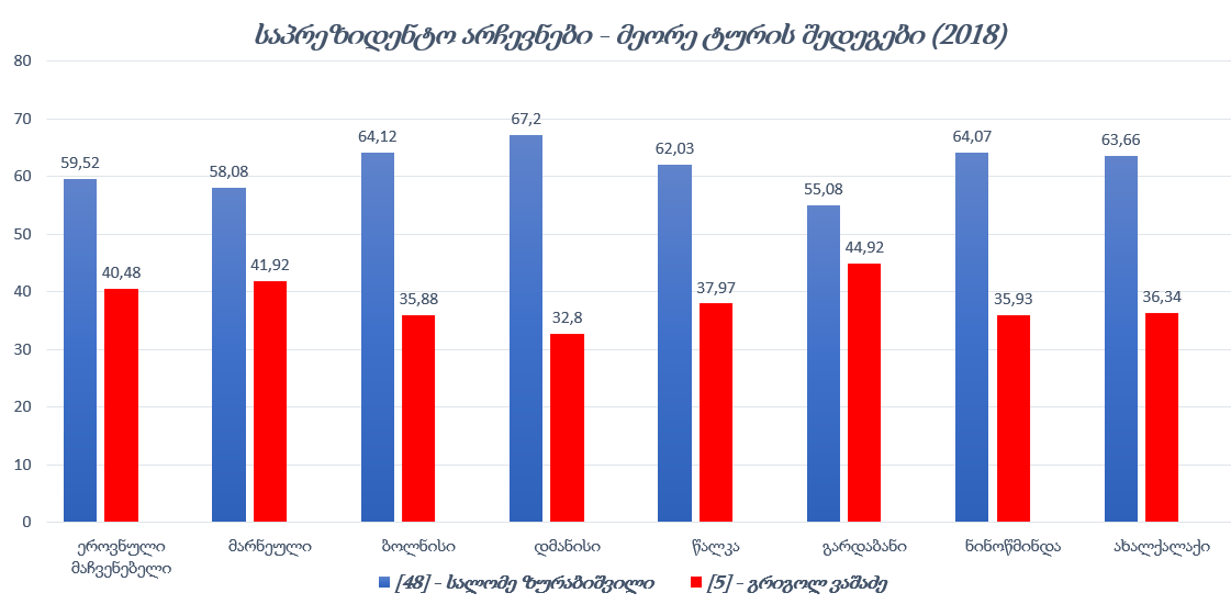 აღსანიშნავია, რომ არჩევნების პირველ ტურში მმართველი პარტიის მხარდაჭერის მიუხედავად, სალომე ზურაბიშვილმა ეთნიკური უმცირესობებით მჭიდროდ დასახლებული 7 საარჩევნო ოლქიდან მხოლოდ ოთხ ოლქში აიღო ოპონენტებზე მეტი ხმა. სახელისუფლებო პარტიის მხარდაჭერის ფონზე, მეორე ტურის შედეგად, სალომე ზურაბიშვილმა 59.52%-ით გაიმარჯვა (საქართველოს საარჩევნო ადმინისტრაცია, 2018).
