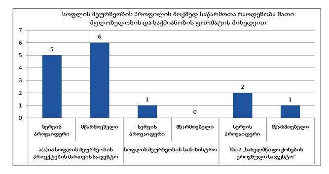 ა(ა)იპ სოფლის მეურნეობის პროექტების მართვის სააგენტოს, სოფლის მეურნეობის სამინისტროსა და ეკონომიკისა და მდგრადი განვითარების სამინისტროს სსიპ „სახელმწიფო ქონების ეროვნული სააგენტოს" მფლობელობაში 71 საწარმოა, მუხედავდ იმისა, რომ რეგისტრირებული სახელმწიფო კომპანიების რიცხვი სოფლის მეურნეობაში საკმაოდ დიდია, მათგან დღესდღეობით მხოლოდ 15 -ია მოქმედი.