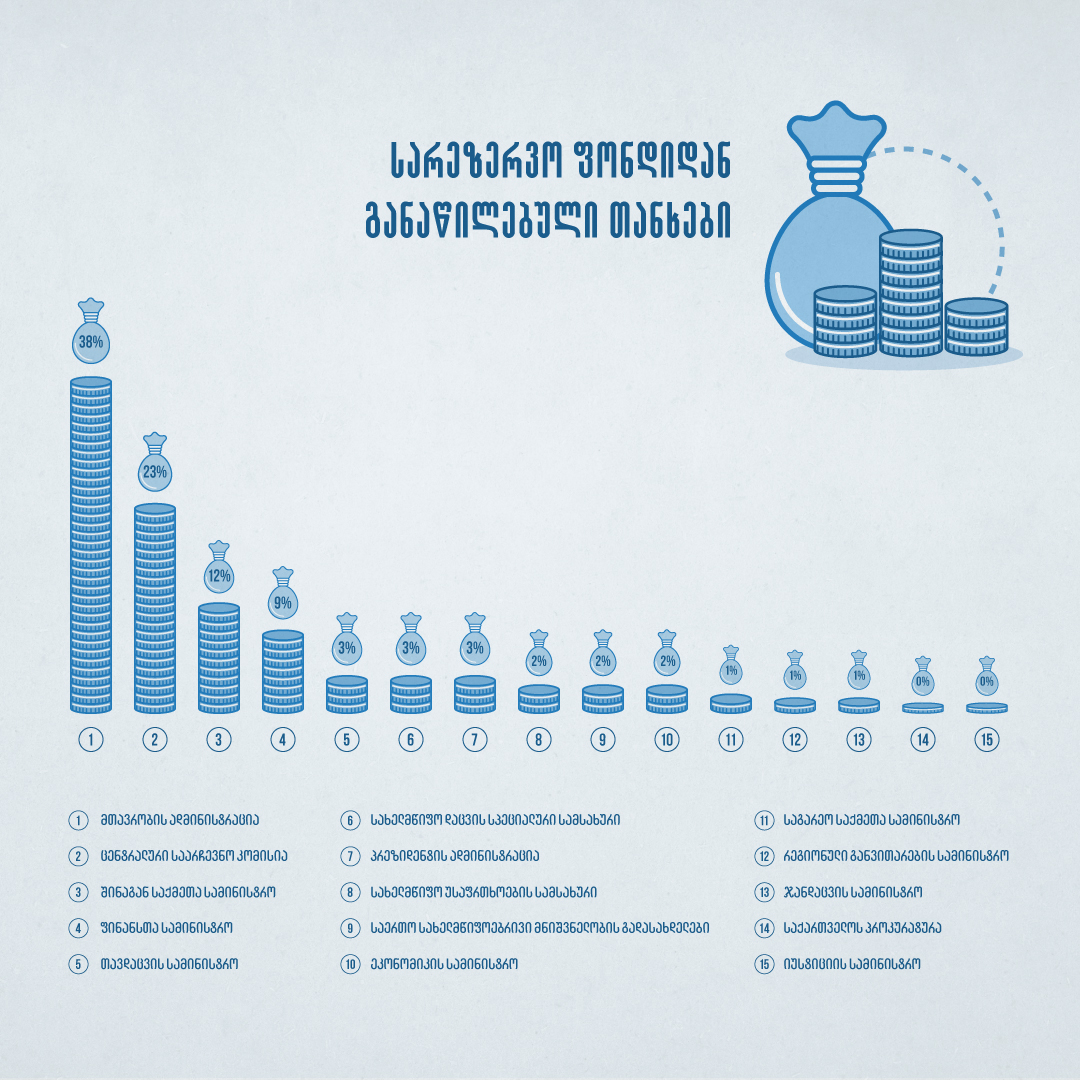 2021 წელს სარეზერვო ფონდიდან თანხის გამოყოფის შესახებ საქართველოს მთავრობამ 26 განკარგულება გამოსცა, რომელთა მიხედვით გამოყოფილი ასიგნებების მოცულობამ 44.8 მილიონი ლარი შეადგინა, ხოლო საკასო შესრულებამ 43.1 მლნ ლარი. უწყებების მიხედვით თანხები შემდეგნაირად გადანაწილდა:
