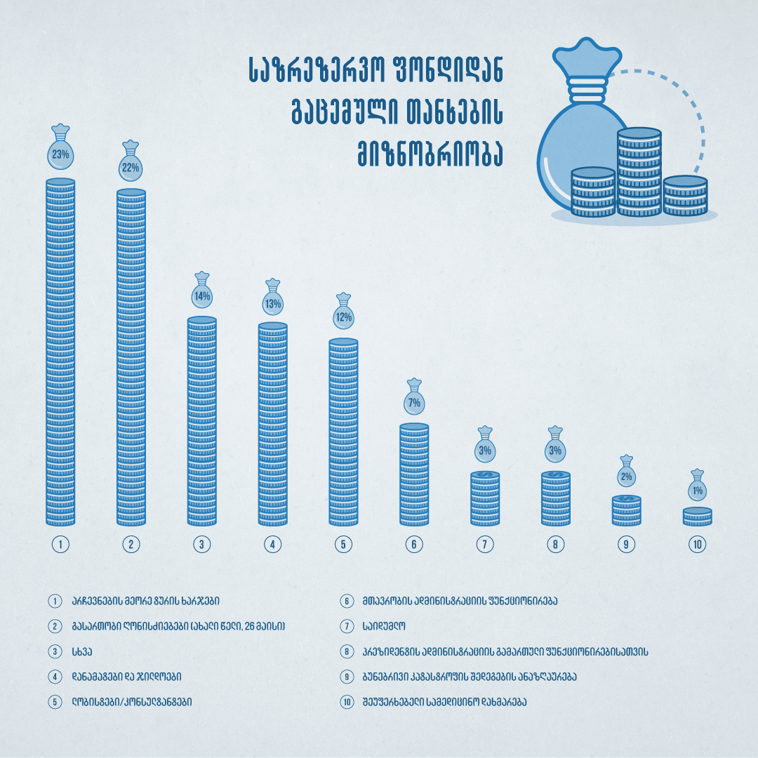 საქართველოს კანონმდებლობით, მთავრობის სარეზერვო ფონდიდან თანხა გამოიყოფა მხოლოდ ბიუჯეტით გაუთვალისწინებელი ხარჯების დასაფინანსებლად.