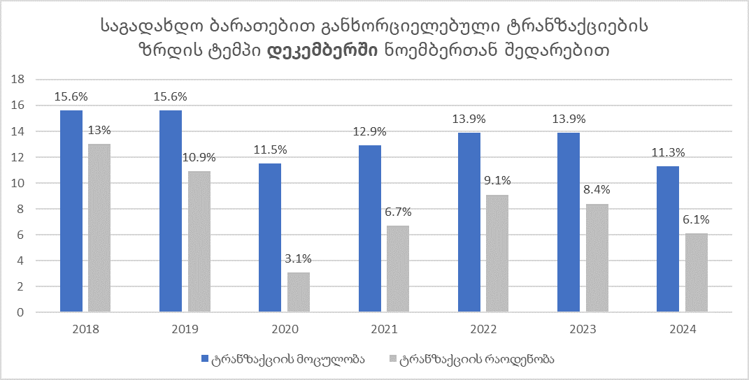 -დეკემბრიდან მოყოლებული, მოსახლეობის მიერ განხორციელებული საბანკო ტრანზაქციები და საბარათე გადახდების ზრდის ტემპი შემცირების ტრენდს აჩვენებს.