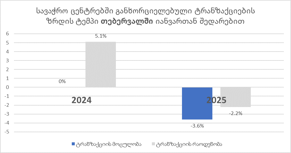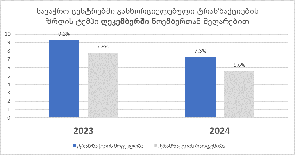 -სავაჭრო ცენტრებში განხორციელებული ტრანზაქციების რაოდენობა და ინტერნეტ გადახდები დეკემბერში კოვიდ პანდემიური 2020 წლის შემდგომ ყველაზე დაბალი ტემპით გაიზარდა. დეკემბერში ნოემბერთან შედარებით ზრდა 5.6% იყო - ნაცვლად 2023 წლის 7.8%-სა. თებერვალში კი იანვართან შედარებით, ტრანზაქციების რაოდენობა 2.2%-ით შემცირდა, მაშინ როდესაც გასულ წელს, ანალოგიური მონაცემი 5.1%-იან ზრდას აჩვენებდა.