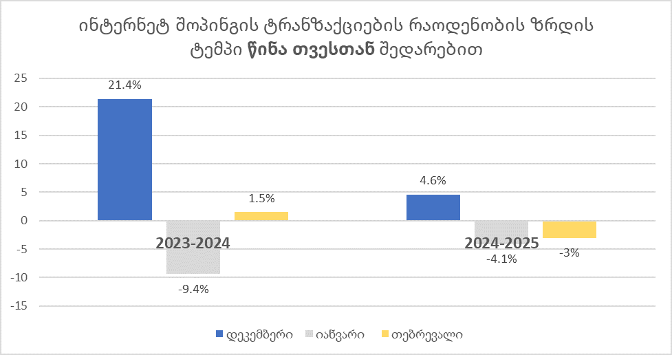 რაც შეეხება ინტერნეტ შოპინგს - ქვეყანაში ინტერნეტ ტრანზაქციების რაოდენობამ პიკურ ზრდას 2020 წელის დეკემბერში მიაღწია - წინა წელთან შედარებით +75.1%. 2021 წლის დეკემბერში მაჩვენებელი წლიურად 14%-მდე შემცირდა, თუმცა 2022 და 2023 წლებში ზრდა კვლავაც მაღალ ნიშნულზე - +19%, +47%-ზე ნარჩუნდებოდა. 2024 წლის დეკემბერში კი შემცირება აჩვენა როგორც წლიურმა მაჩვენებელმა, ასევე წინა თვესთან შედარებამ. წლიურად ინტერნეტით განხორციელებული ოპერაციების რაოდენობის ზრდის ტემპი +7.6%-მდე შემცირდა, წინა თვესთან შედარებით კი ზრდა 4.6% იყო, მაშინ როდესაც ერთი წლით ადრე ეს მაჩვენებელი 21%-ს აღწევდა. რაც შეეხება იანვარს, ინტერნეტ ტრანზაქციების რაოდენობის ზრდის ტემპი წლიურად ბოლო წლებში ყველაზე ყველაზე დაბალი ტემპით გაიზარდა, წინა თვესთან შედარებით კი ტრადიციულად კლება დაფიქსირდა. კლების ტრენდი გაგრძელდა თებერვალშიც, როდესაც ინტერნეტ ტრანზაქციების რაოდენობა წლიურად 8.9%-ით გაიზარდა, მაშინ როდესაც წინა წელს ზრდა თითქმის 49% იყო. წინა თვესთან შედარებით კი ტრანზაქციები რაოდენობრივად 3%-ით შემცირდა, მაშინ როდესაც წინა წელს ეს მაჩვენებელი 1.5%-ან ზრდას აჩვენებდა.