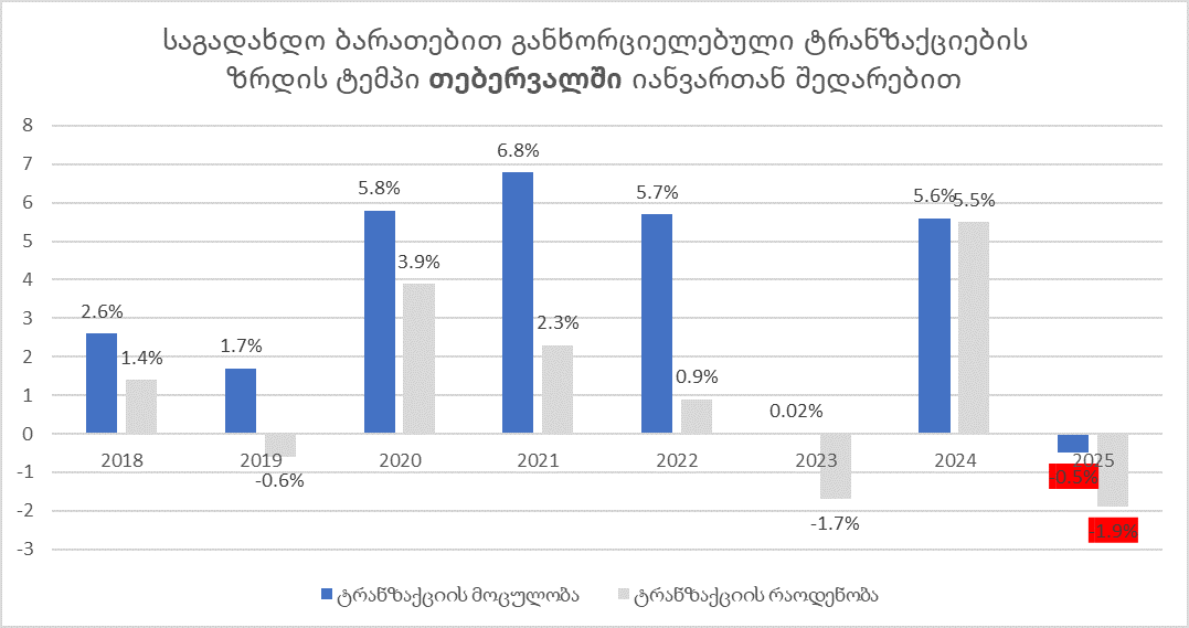 - 2025 წლის თებერვალში საბანკო ბარათებით განხორციელებული ტრანზაქციების მოცულობა იანვართან შედარებით 0.5%-ით შემცირდა, რაც ისტორიულად ამ პერიოდში კლების პირველი შემთხვევაა.