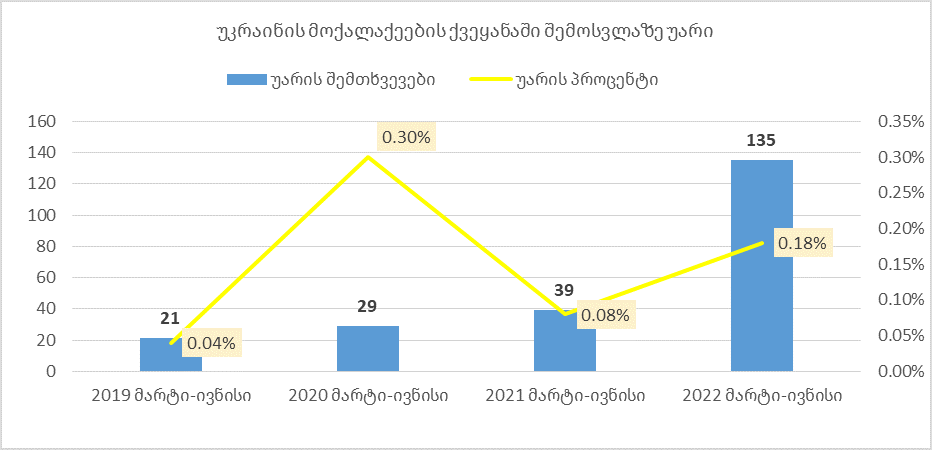 - 2022 წლის მარტი-ივნისის თვეში საქართველოში შემოსვლაზე უარი ეთქვა რუსეთის 3,036 მოქალაქეს, უკრაინის 135 მოქალაქეს, ხოლო ბელარუსის მხოლოდ 41 მოქალაქეს.