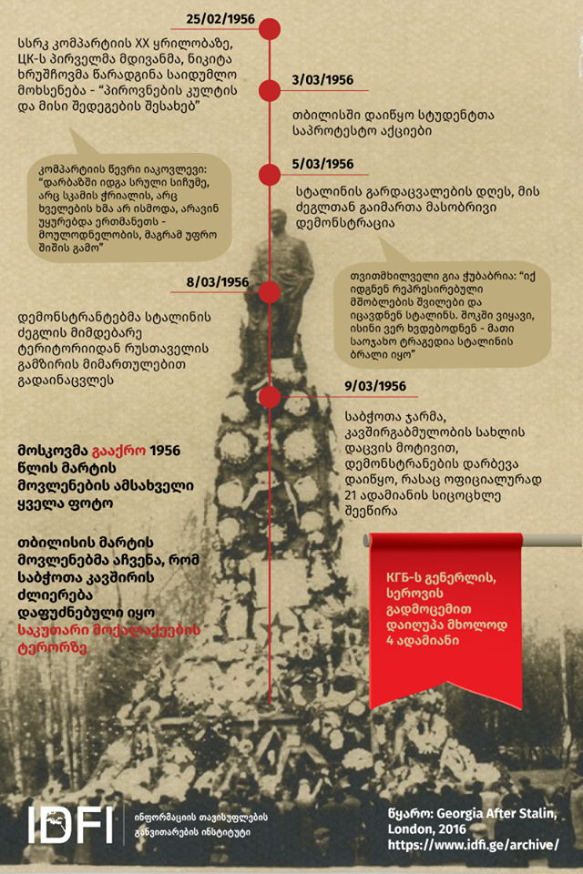 ხრუშჩოვის საიდუმლო მოხსენების ნაწილები თბილისშიც გავრცელდა, რამაც გამოიწვია 1956 წლის მარტის ცნობილი მოვლენები. სტალინის სახელის დასაცავად გამართულ გამოსვლებზე კი შეინიშნებოდა ეროვნული სენტიმენტების მომძლავრებაც და შესაბამისი ლოზუნგებიც, რაც, საბოლოო ჯამში, ძალოვანმა სტრუქტურებმა სისხლში ჩაახშეს. აღსანიშნავია, რომ დამოუკიდებლობის შესახებ მოწოდებები და პირველი დისიდენტური მოძრაობები საქართველოში სწორედ 1956 წლის მოვლენების შემდეგ გაჩნდა[14].