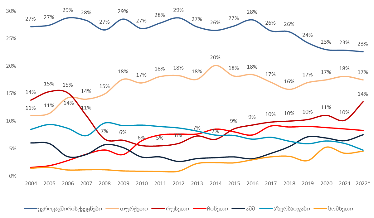გრაფიკი 1: ქვეყნების წილი საქართველოს ექსპორტში 2004-2022 წწ.